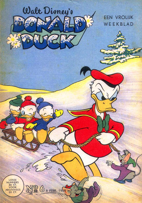 Lex Overeijnder also goes down in history as one of the earliest local artists for the Dutch Disney weekly Donald Duck. The magazine was launched in the Netherlands by De Geïllustreerde Pers on 25 October 1952, following the Scandinavian success of magazines with Walt Disney's short-tempered duck as title character. The early issues were filled with American material, but sporadically Dutch artists were hired to make some new cover artwork. The illustrators of the first ones are unknown, but issues #35 and #38 of that year are believed to have a cover drawn by Overeijnder, and then Endre Lukács became the true pioneer of Dutch Disney comics. Lex Overeijnder illustrated seven more covers in 1958 and 1959, often reworkings of American originals.