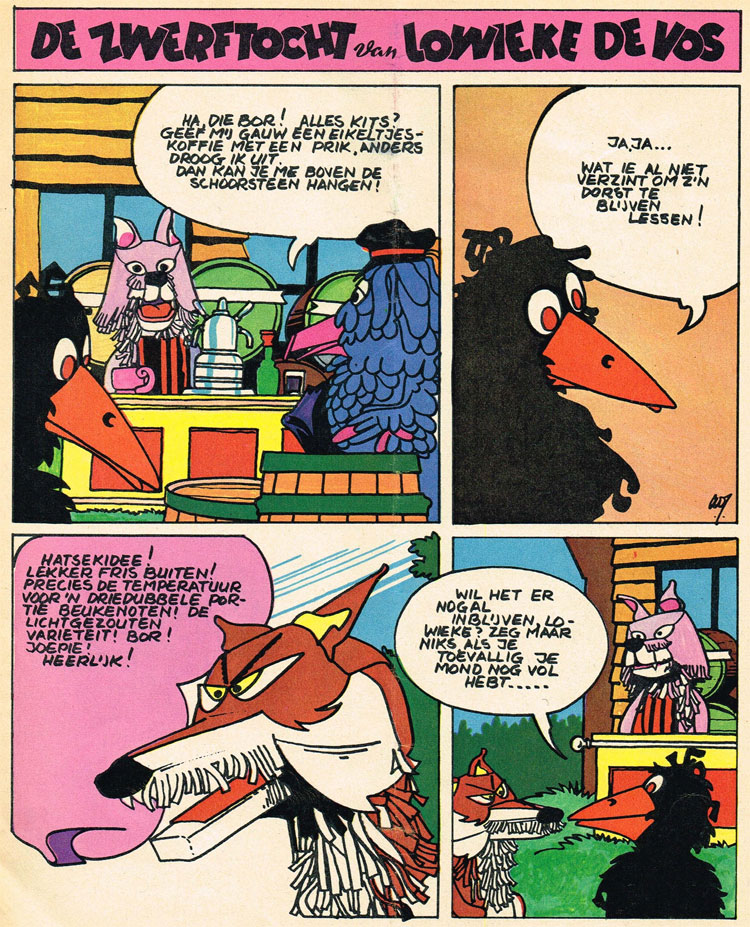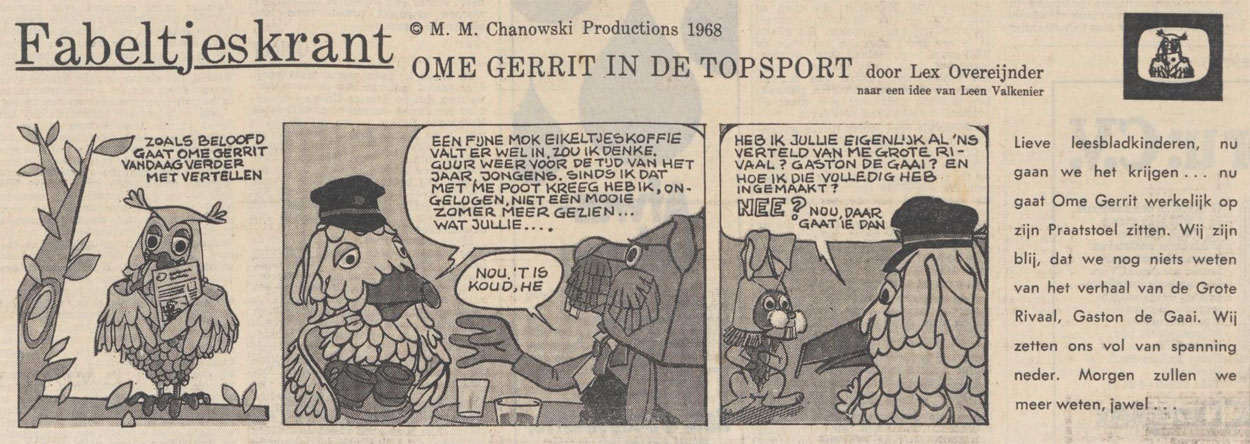 Overeijnder made a deal with the Co-op supermarket chain to create dolls based on the TV stop-motion series 'De Fabeltjeskrant'. While the plans fell through he and TV producer M.M. Chanowski kept in touch. He asked Overeijnder to create a celebrity comic based on 'De Fabeltjeskrant'. The children's series about a group of forest animals was extraordinarily popular. In each episode the host Meneer De Uil (Mr. Owl) read from his newspaper to tell viewers what happened in the Animal Forest that week. With its roots in the classic fables of De La Fontaine, Aesop and Phaedrus, the series also featured the all-knowing Juffrouw Ooievaar (Miss Stork) and her helper Zoef de Haas (Zippy the Hare), the ever-busy Truus de Mier (Miss Ant), bar owner Bor de Wolf (Boris the Wolf), the sly Lowieke de Vos (Mr. Cunningham) and the DIY Beaver brothers, among many other characters. 'De Fabeltjeskrant' would run for three TV series (1969-1974, 1985-1989, 1996) and achieve iconic status. Overeijnder's comics version debuted in newspaper Het Parool on Monday 1 September 1969, and focused on "Ome Gerrit" the mail pigeon. It ran for barely a month, until 17 October. During the same period, Overeijnder provided artwork to numerous 'Fabeltjeskrant' products, from booklets and puzzles to wallpaper. He made sure he kept the characters close to their original puppet designs.