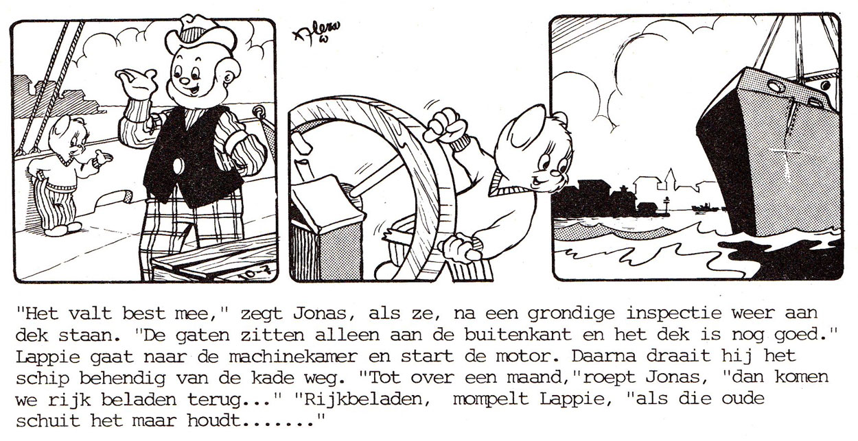Overeijnder settled in Alkmaar and worked on several comic series throughout the 1950s. These were mostly innocent children's stories in an accessible and non-pretentious drawing style. Many had funny animal-style lead characters, obviously inspired by Marten Toonder's successful newspaper comics 'Tom Poes' and 'Panda'. They also reflected the author's love for nature. Overeijnder sold his first comic, 'Peter Pluim', for 50 guilders (roughly 23 euros) a week to the women's magazine Eva: it was serialized there for a year. His comic 'Willie Beer' (1952-1958), about a bear, ran in Revue for six years. Between 17 July 1956 and 2 June 1958, he wrote and drew seven charming magical adventure stories starring the cute rabbit 'Lappie Knijn' (1952-1958). Lappie was accompanied by a human peddler named Jonas. The comic ran both in the newspaper Trouw, as well as the papers of the "Rotterdammer Kwartet", a cooperative between four local newspapers from the Rotterdam region. Some papers ran the strip under the title 'Lappy Loep'. Anton de Zwaan's Swan Features Syndicate distributed them to other countries too, including England, France, Germany, Portugal and Iceland. The adventures of the circus boy 'Floske' (1957) appeared in Wereldkroniek, while the adventures about a mouse and a dog, 'Flip en Flop' (1959), ran on a weekly basis in the "Gemeenschappelijke Provinciale Dagbladpers", a group of regional papers.