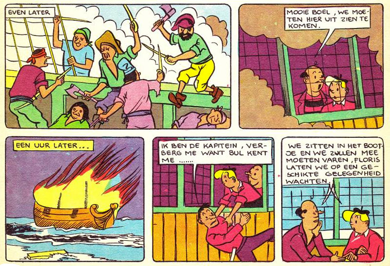 During the 1950s, Overeijnder also maintained a regular collaboration with the Amsterdam-based publishing house Mulder & Zoon. His first production for the company was presumably a series of eight "accordion booklets" with the adventurous 'Jantje Strop' (1951-1952). They were a mix between text comics and picture books, and had all the ingredients of stereotypical naïve 1950s adventure stories. Jantje enjoyed adventures in the sky, on the sea, in a "Negro village" and in Morocco, among other places. The booklets were unsigned, but the artwork resembles Overeijnder's best-known comic series for Mulder, 'Daantje Durf' (1954). Daantje and his pal Binkie were sailors, and roamed the seas for parts unknown. Some adventures even brought them to outer space, such as 'Ruimtevaarders Gevraagd' (#4) and 'Naar De Rode Planeet' (#6).