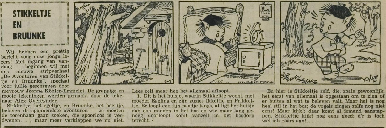 During the 1960s, most of Overeijnder's comic series had come to an end. However, Swan Features did syndicate a new strip called 'De Avonturen van Stikkeltje en Bruunke', about a hedgehog and a toy bear. Written by Jeanne Köhler-Emmelot, the strip appeared in Het Binnenhof in 1960 and in the Nieuwe Leidsche Courant in 1966-1967. Since comics didn't provide him with enough income to support his family, Overeijnder's main activity became advertising. Already during the 1950s, he was making folders and advertisements for Alkmaar's local industries. He also made an occasional advertising comic during this period, such as 'De Avonturen van Rik Ransel' (1959) starring the soldier mascot of Kwatta chocolate, and two mini-books of 'Pim Pienter' (1963) for grocery store chain De Gruyter. He also made the pantomime comic strips 'Cardi' and 'Karon' (1963) for Dafbode, the staff magazine of the DAF factories.