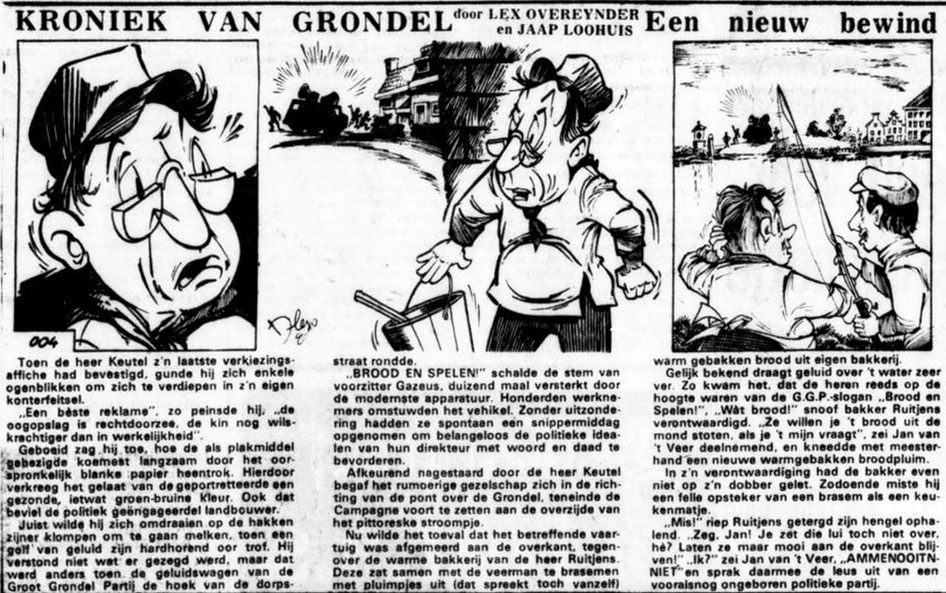 During the 1970s, Overeijnder returned to the Veluwe region, and settled in Vaassen, a village near Epe. Between 1974 and 1977, he served as alderman in the Epe city council for the local party Nieuwe Linie. It inspired him to create his final comic series, the newspaper comic 'De Kroniek van Grondel' (1974-1975), which offered mild satire based on conflicts and everyday situations in local politics through the three parties in the fictional town of Grondel. The strip appeared as a traditional text comic in De Telegraaf from 7 September 1974 until 2 September 1975, and showed not only influences from Marten Toonder's 'Koning Hollewijn', but also André Franquin's 'Gaston Lagaffe' (the character Pep in particular). Overeijnder asked Jaap Loohuis to provide the text captions based on his ideas.