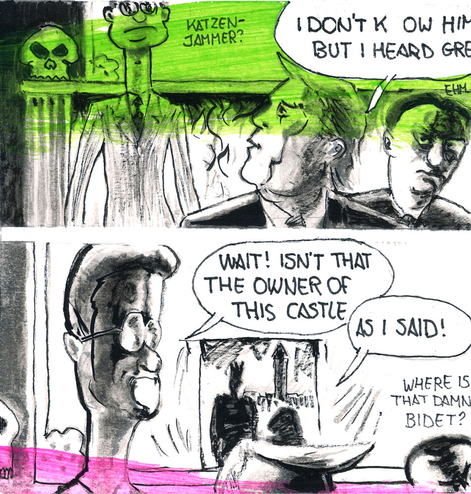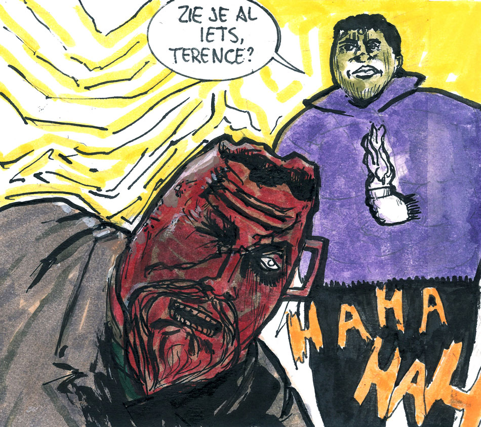 Marcel van Breda's recurring feature in Project Uhm... was 'Jaws Ontheground', about the rise and fall of a master criminal. Among his other contributions to the zine were 'Sjaan Opendown' (a spin-off about one of the prostitutes from the Jaws comic), 'Grote Ogen' (about a cat who gets stuck behind a fence) and 'Zombie' (about someone who is so stoned that he almost falls apart), as well as the scripts for a couple of gags about a teacher, drawn by Jochen Markhorst. Together with Gerben den Heeten, he briefly returned to comics in 1995 with the one-shot comic 'Het Projekt', for which he created the autobiographical stories 'Depressum Requiescat' (drawn by Koen Brosens) and 'Kots' (drawn by himself), dealing with his life in Amsterdam's alternative art and drug scene.