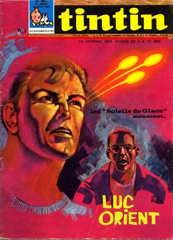 In 1967, Paape teamed up with Michel Greg to start his best-known work, the contemporary science fiction series 'Luc Orient'. The first story took off in issue #3 of Tintin (19 January 1967). In Kuifje, the Dutch-language version of Tintin, 'Luc Orient' ran under its original title. For Paape it was a welcome change to the heavy-documented historical comics he used to draw. He could use his imagination and experiment freely with page lay-outs, coloring and backgrounds. The result was a comic which was quite innovative for its day, since its genre was generally considered pulp. The main character was an athletic physicist, who had adventures involving aliens and scientific mysteries. He was accompanied by a professor, Hugo Kala, and his secretary Lora.