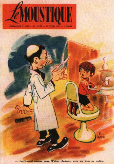When Nagant's studio closed its doors in the summer of 1945, Paape found employment in a puppet workshop. André Franquin and Morris eventually introduced him to Dupuis, the publisher of magazines like Spirou, Le Moustique and Bonnes Soirées. The former C.B.A. employees formed a studio in the center of Brussels, where Paape became a productive illustrator for the women's weekly Les Bonnes Soirées. One of his other early jobs was assisting Jijé on the ink wash drawings of his monumental comic about the life of Jesus Christ, 'Emmanuel' (1946). Eddy Paape later moved to Marcinelle, the homebase of his publisher. A quick and loyal draftsman, he became an allround illustrator for the publisher's magazines. From text stories to covers and from cartoons to caricatures, Paape was asked for all kinds of rush jobs. The same year he was handed Jijé's comic series about 'Jean Valhardi', a detective with an insurance company. Paape's run on the comic debuted in Spirou magazine with the story 'Les Rubens' in 1946. This was however not the first story he had drawn for this series. His first effort, 'Sur le Rail', would only be published next year in the legendary Spirou Almanach, an annual which introduced the new writers and artists to Spirou's readers. It also contained Franquin's first 'Spirou et Fantasio' story, and the debut of 'Lucky Luke' by Morris.