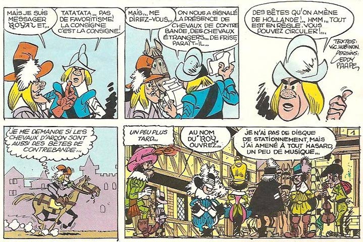 During his tenure with Spirou, Paape made contributions to other magazines as well. He made several short stories, as well as the story 'Ned Tiger' (script by Jean-Michel Charlier, 1962) and the comical feature 'Pathos de Sétungac' (script by Victor Hubinon, 1963-1965), for the children's monthly Record of Bayard Presse. He was also present in Charlier's own magazines Pistolin (1955, 1958) and Pilote (1961-1966) with short stories, illustrations and game pages, often under the pseudonyms Péli and Jo Legay. Between 1953 and 1960, he produced dozens of educational stories in the series 'L'Histoire de la Semaine' in the newspaper La Libre Belgique and its supplement La Libre Junior, which he signed Milpatt.