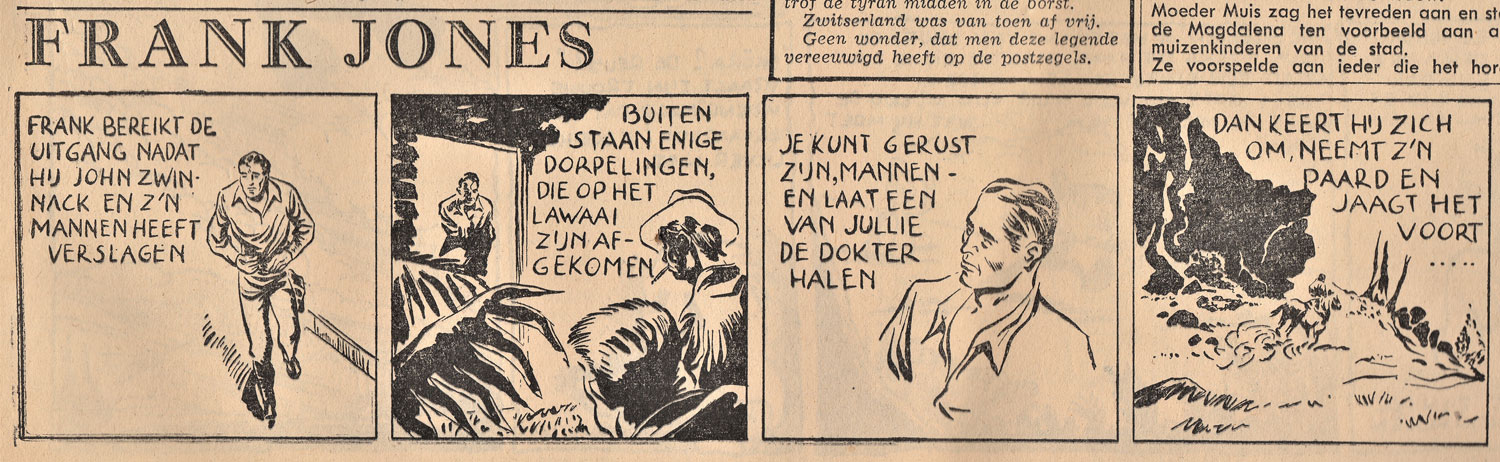 Between April and December 1948, Paid drew the adventures of the equally heroic 'Frank Jones' for Wim Meuldijk's Ketelbinkie-Krant. Around that same period, he allegedly also helped his former Stripfilm colleague Albert van Beek with the gag strip 'Baron Bluf en Bartholomeus' (1948-1949) for the Toonder Studio's. It marked the end of Francis Paid's short stint as a comic artist, of which he was not particularly proud. Later in life he refused to talk about his forays into this so-called "inferior" art form. Frans Piët continued his career at the local newspaper Zandvoortse Courant, of which he eventually became editor-in-chief in the 1970s. He passed away in 1996.