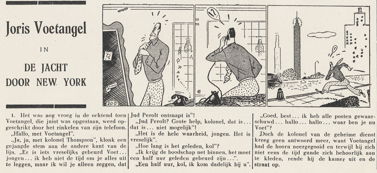 While the other Stripfilm artists developed jolly comic strips with round, comical characters, Francis Paid sought his inspiration elsewhere. His muscular secret service agent 'Joris Voetangel' was made in the tradition of Alfred Mazure's hard boiled detective 'Dick Bos', and used his brains and brawn to fight criminals. Written by Joop Elenbaas, 'Joris Voetangel weet er raad op' was a product of its time and the post-war Americanization. The text comic presents naïve depictions of American cars and buildings, while the characters still have typically Dutch names, with protagonist Joris Voetangel and commissioner Bolkewroeter as main examples. The strip ran for 68 episodes in the local newspaper Amsterdamsch Dagblad from June 1945 on, until it was replaced by Phiny Dick's 'Olle Kapoen'. Only the first 54 strips were eventually collected in a 1946 booklet by N.V. Strips i.o. (Boom-Ruygrok) in Haarlem. A second book, 'In het Hol van de Leeuw', was announced but never published.