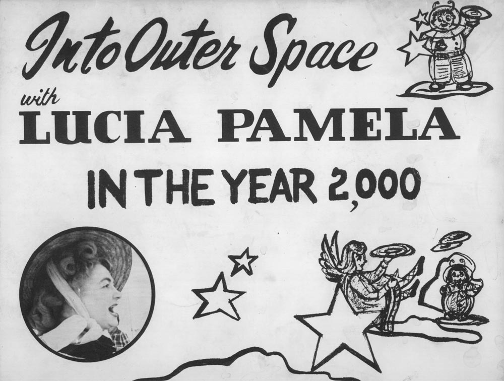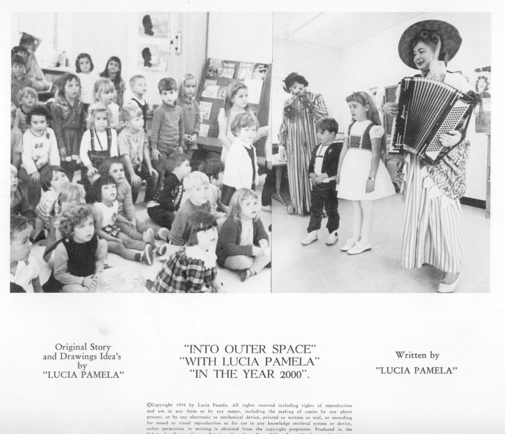 As such, it wasn't surprising that some record producer actually took a chance with her. In 1969, Pamela recorded 'Into Outer Space with Lucia Pamela' (Gulfstream Records, 1969). Released two months before Neil Armstrong made his historic voyage, it's a musical concept album for children about her supposed trip to the Moon. Pamela describes how she saw a city, a Native American wedding and a bunch of barnyard animals on the lunar surface. She sings with tremendous, somewhat grotesque enthusiasm. While not a skilled singer, her musicianship is impressive. She plays all instruments (piano, clarinet, drums, accordion and even household appliances) personally. The singer claimed that her moon voice was different from her voice on Earth, because "the air is different up there, you know." In reality, the odd echo effects were supplied by the producer, Vince Ferino, who recorded everything with the sound-on-sound button activated.