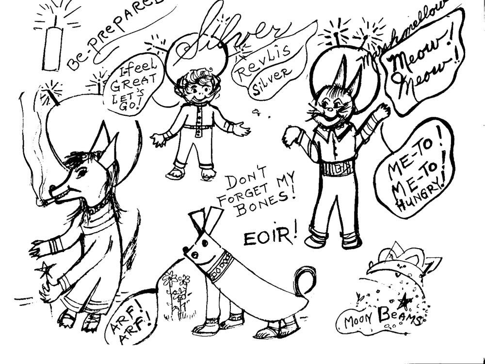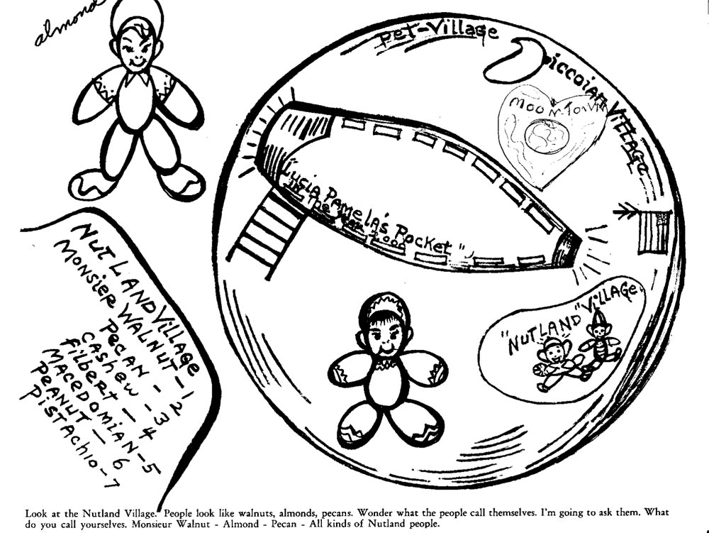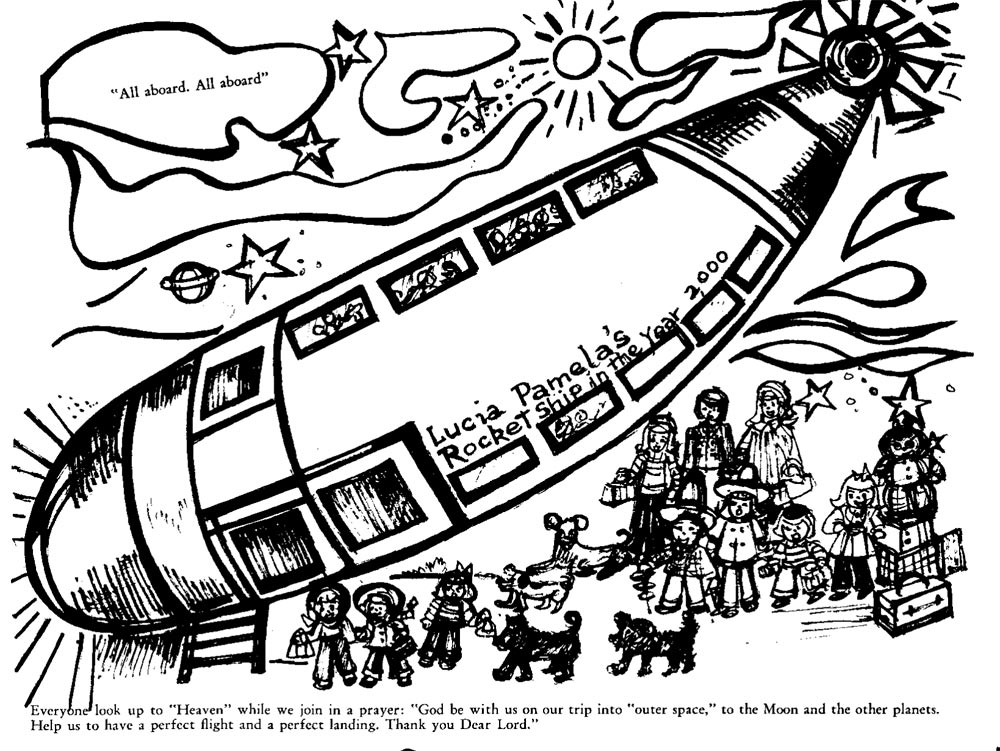 Despite Pamela's efforts, the album didn't sell many copies. In 1976, she nevertheless felt the world could use another merchandising item attached to it. She drew her own coloring book, 'Into Outer Space with Lucia Pamela in the Year 2000', which mostly follows the narrative of the album, but also includes some new material. For instance, she mentions a visit to Nutland village, "where all people are made of nuts", and Inuit people living on the moon. Much like the record, the coloring book is the work of an adorable innocent amateur. Her ambitions were quite high. She invited all buyers "all across the world, between age 3 and 80", to color everything in and mail the results to her home address, as part of a contest. Nobody actually seems to have done this, but then again she never announced a time limit to the contest.