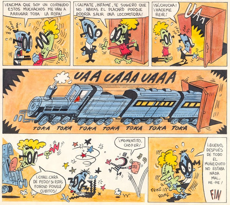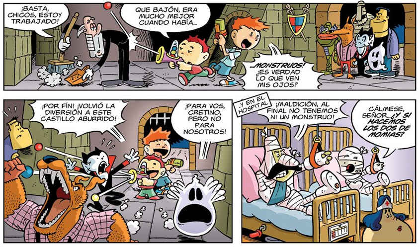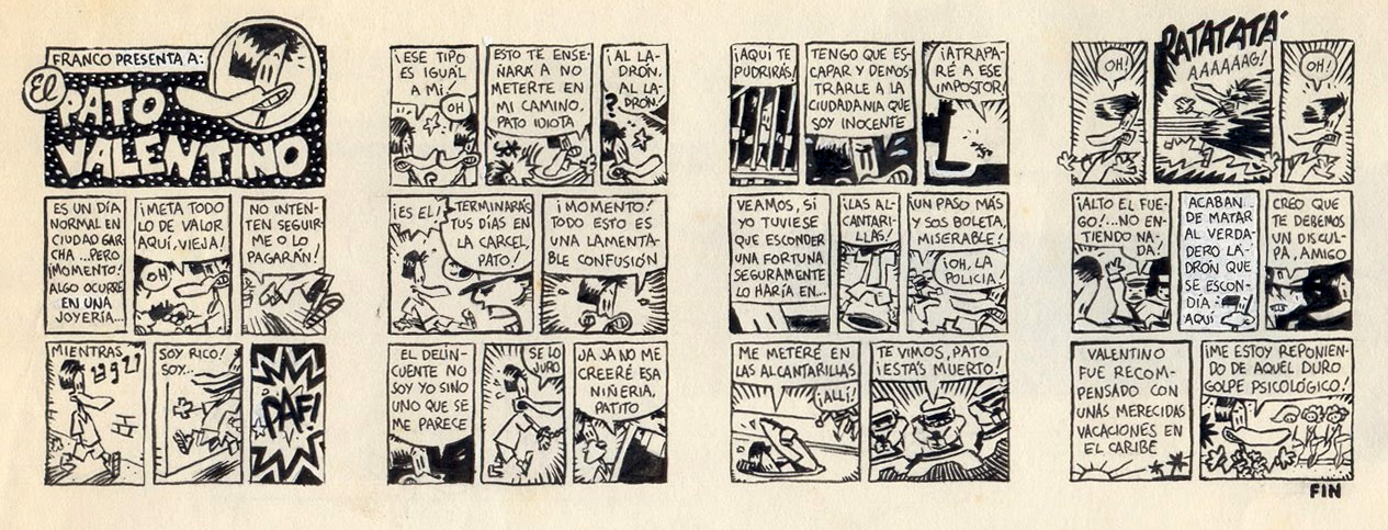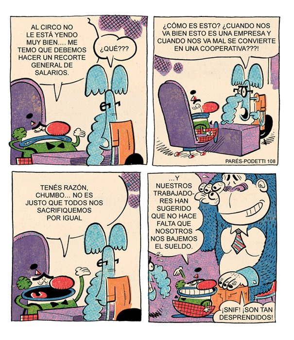 In the meantime, Diego Parés established himself as one of the most notable syndicated cartoonists of his country. He often works together with the Argentinian humorist Esteban Podetti (a.k.a. Podeti). Besides comic stories for Fierro magazine, they also make cartoons and features with political satire for the Télam press agency. The two men also created the daily strip 'Chumbo, el Hombre Elefante' ("Chumbo, the Elephant Man", 2012-2013).