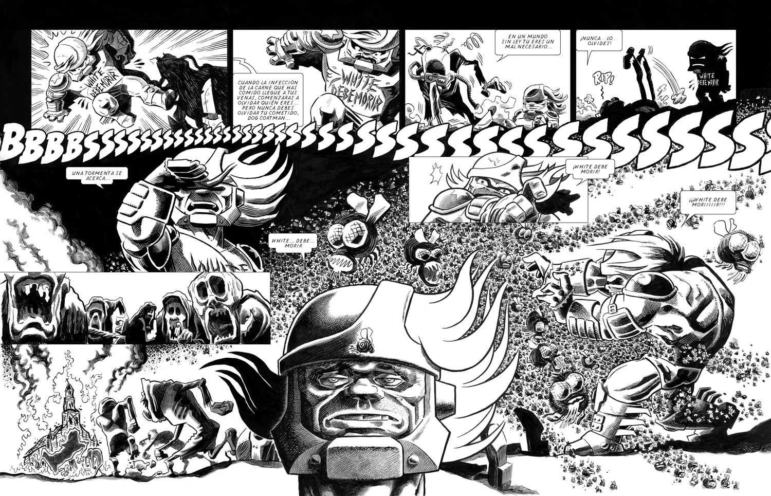 By the time Diego's brother Pablo and his writing partner Daniel de la Vega had become well-known directors with the "American gothic" film 'Jennifer's Shadow' (2004), they began working on a post-apocalyptic zombie film set in South America. The project never saw the light, but the script was used by Diego Parés for a comics project instead. Parts of it were published in Fierro magazine in 2008, but this project remained unfinished as well. Diego's imagery in turn inspired the directors duo to create the vintage style low budget film 'Soy Tóxico' ('I Am Toxic', 2018).