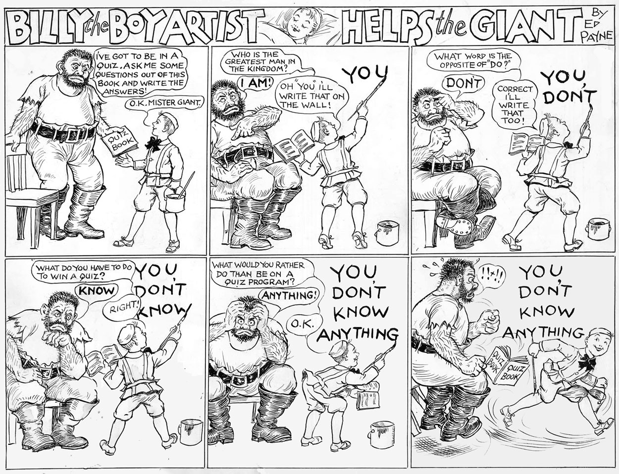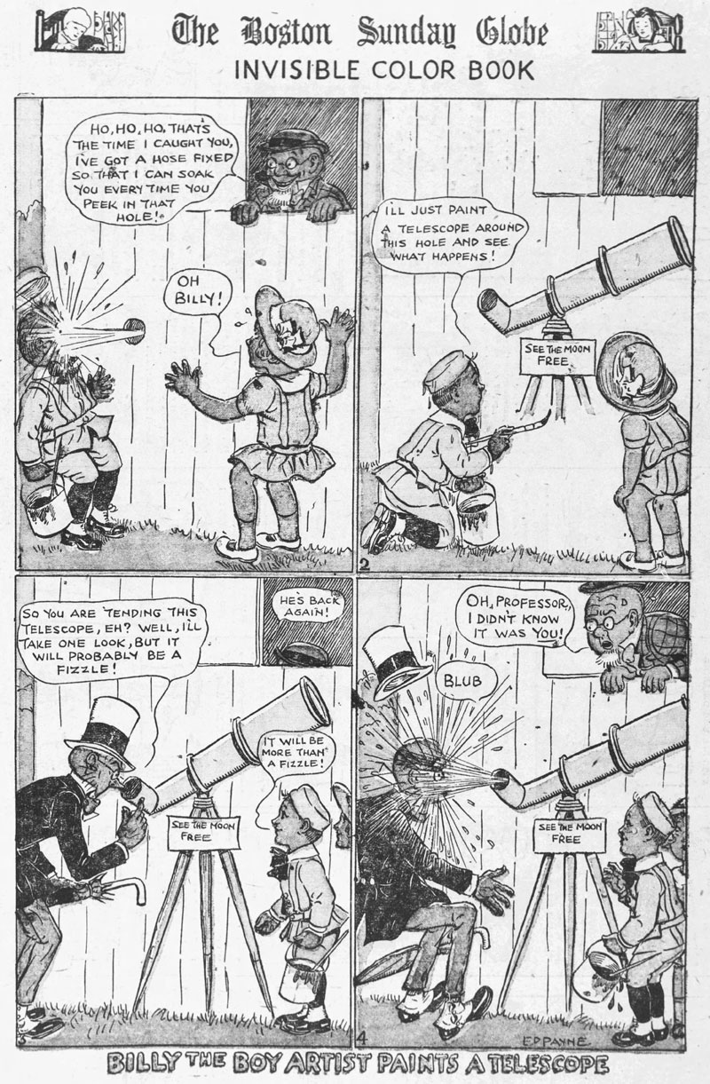 Ed Payne was an early to mid-20th century American cartoonist, who had a long association with the Boston Globe. Working for the paper since the late 1890s, Payne created several comics features for the color Sunday supplement. Most notably 'Billy the Boy Artist' (1899-1955), which he wrote and drew for a staggering 56 years, allegedly without any assistance. This makes him one of the all-time record holders for longest-running comic series by one individual. His second best-known comic strip was 'Professor O. Howe Wise and Professor I.B. Schmart' (1902-1911). At the time, both comics were adapted into theatrical plays.