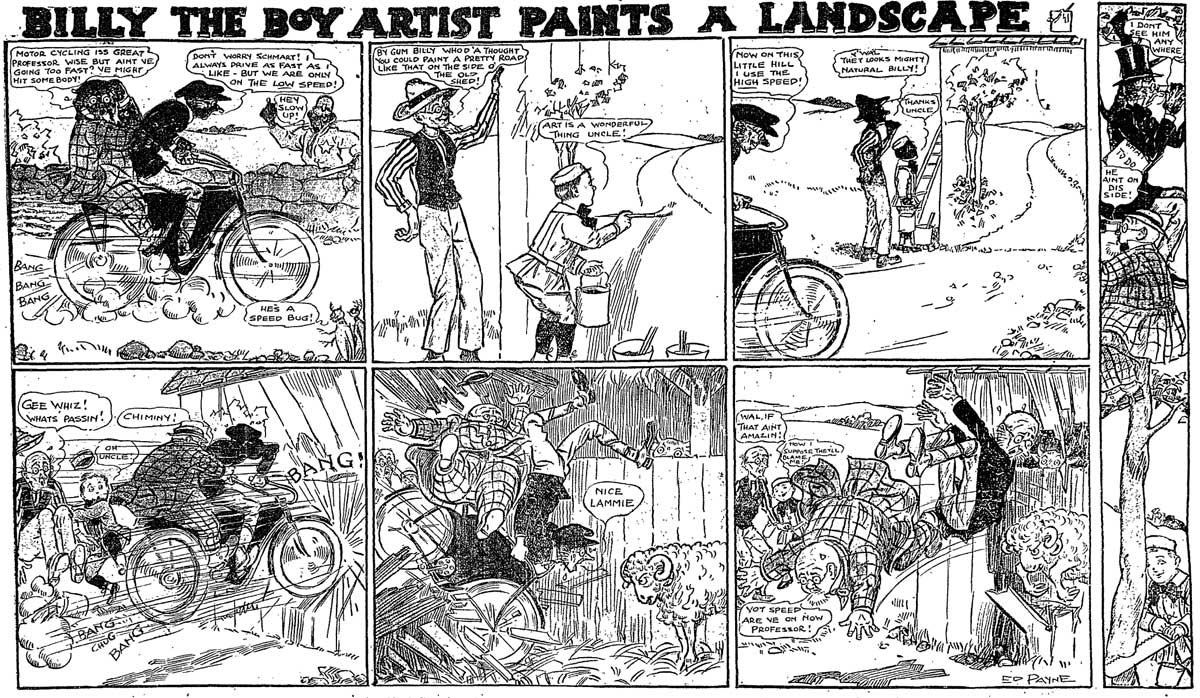 In addition to Billy, Ed Payne created several other Sunday comics for the Globe. The longest-running of these was 'Professor O. Howe Wise and Professor I.B. Schmart', which appeared from 27 April 1902 until 1 January 1911. Professor O. Howe Wise never went anywhere without his book on "What To Do", while his colleague I.B. Schmart always carried his book on "What Not To Do". The professors regularly appeared in the 'Billy' strip as well. Shorter-lived creations were 'Hiram Bluejay' (6-20 April 1902), 'Down On The Farm' (A.K.A. 'The Colt Family', 3 May 1903 - 18 Sep 1904), 'Percy Gusher' (11-18 December 1904) 'Mister Hurry-Up the Minute Man' (8 January - 23 April 1905) and the 'Professor O. Howe Wise' spin-off 'Jingles, Poet of the Pike' (28 July 1907 - 24 October 1909). According to newspaper comic expert Allan Holtz, Payne was most likely also the artist behind 'Windy' (17 September 1933 - November/December 1934), credited to "Rube Franklin".