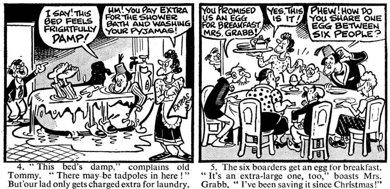 During the 1950s, Pease was a staple in all three of these celebrity comic magazines. In Radio Fun, he made comic features based on popular radio hosts, comedians and ventriloquists, including 'Max Bacon' (1948), 'Peter Brough & Archie Andrews' (1949), 'Douglas "Cardew" Robinson the Cad of St. Fanny's' (1949), 'Round the World with Stan Stennett' (1954-1956), 'Hylda Baker & Cynthia' (1956-1957) and 'Mikki the Martian' (1959). Radio Fun also ran his comic strips 'Right Up Your Street' (1948) and 'Tilly the Terror' (1957-1959). To the parent magazine Film Fun - the AP's oldest celebrity comic paper - Pease contributed comic strips about the comedians Ronald Shiner (1954-1959) and Tommy Cooper (1955-1959), while Radio Fun printed his feature 'Inventor's Circle' (1953-1954), that returned in 1958 as 'Inventors Club'.