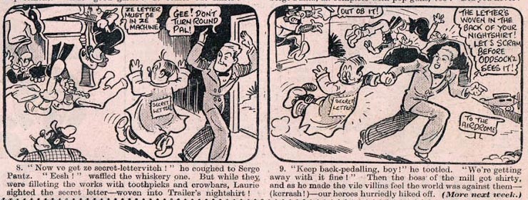 From 1926 until its final issue in 1953, the AP magazine with the most Charlie Pease contributions was Illustrated Chips. One of his early features was 'Buck an' Nero' (1926-1930), about two "Saucy Smugglers" sneaking around the English shores on Captain Dogsbody's ship the Jolly Roger. During the late 1920s and 1930s, he succeeded Bertie Brown on 'Film Struck Fanny' (1926-1933) - about a maid who tries to make the grade in the movies - and the zany detective feature 'Ivor Klue' (1936-1946). Another long-running Illustrated Chips feature by Charlie Pease was 'The Comic Jungle Capers of Monty Monk' (1930-1940), one of the magazine's rare funny animal series. On 5 October 1935, Pease launched 'Laurie and Trailer, the Secret-Service Lads' (1935-1953), about two special agents trying to snatch back the Secret Plans stolen by the fiendish spies from Sock-Suspenda. During the 1930s, Pease also drew the magazine's popular long-running single-panel 'Casey Court' cartoon feature. It featured a gang of poor children, who avidly try to earn heaps of money in their tenement courtyard through a series of ill-fated plans. Originally created in 1902 by Julius Stafford Baker II, 'Casey Coart' was continued by a host of artists from the 1920s until 1953, besides Pease including Walter Bell, M.C. Veitch, H. O'Neill, Louis Briault and Allan Morley. Charlie Pease was the most notable of the lot, delivering crowded and highly detailed depictions of childhood imagination on a weekly basis.
