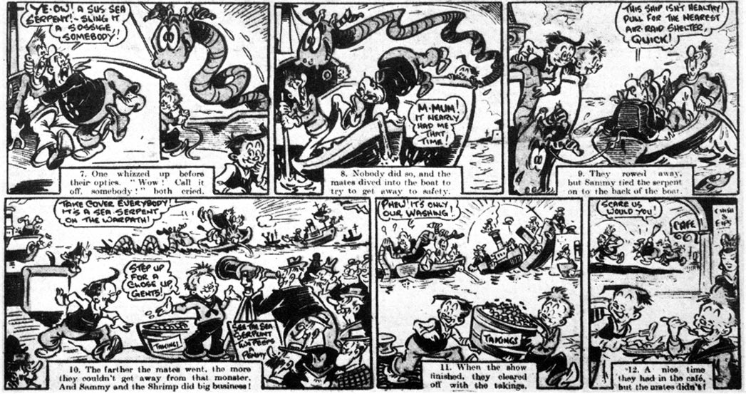 Among Charlie Pease's shorter-lived Comic Cuts features were 'Julius & Sneezer' (1928), 'Manikin Mansions' (1932), 'Our Comic Cartoonist' (1932), 'Percy the Poet' (1933), 'Tinker & Tich' (1936) and 'Captain Clipper & Flipper' (1938). On 10 February 1951, his new feature 'Wizzo Ranch' - a "Gurgle-making Gang of Japers in the Wild and Woolly West" - appeared on the magazine's front page. It continued until September 1953, when Comic Cuts merged into Knockout.