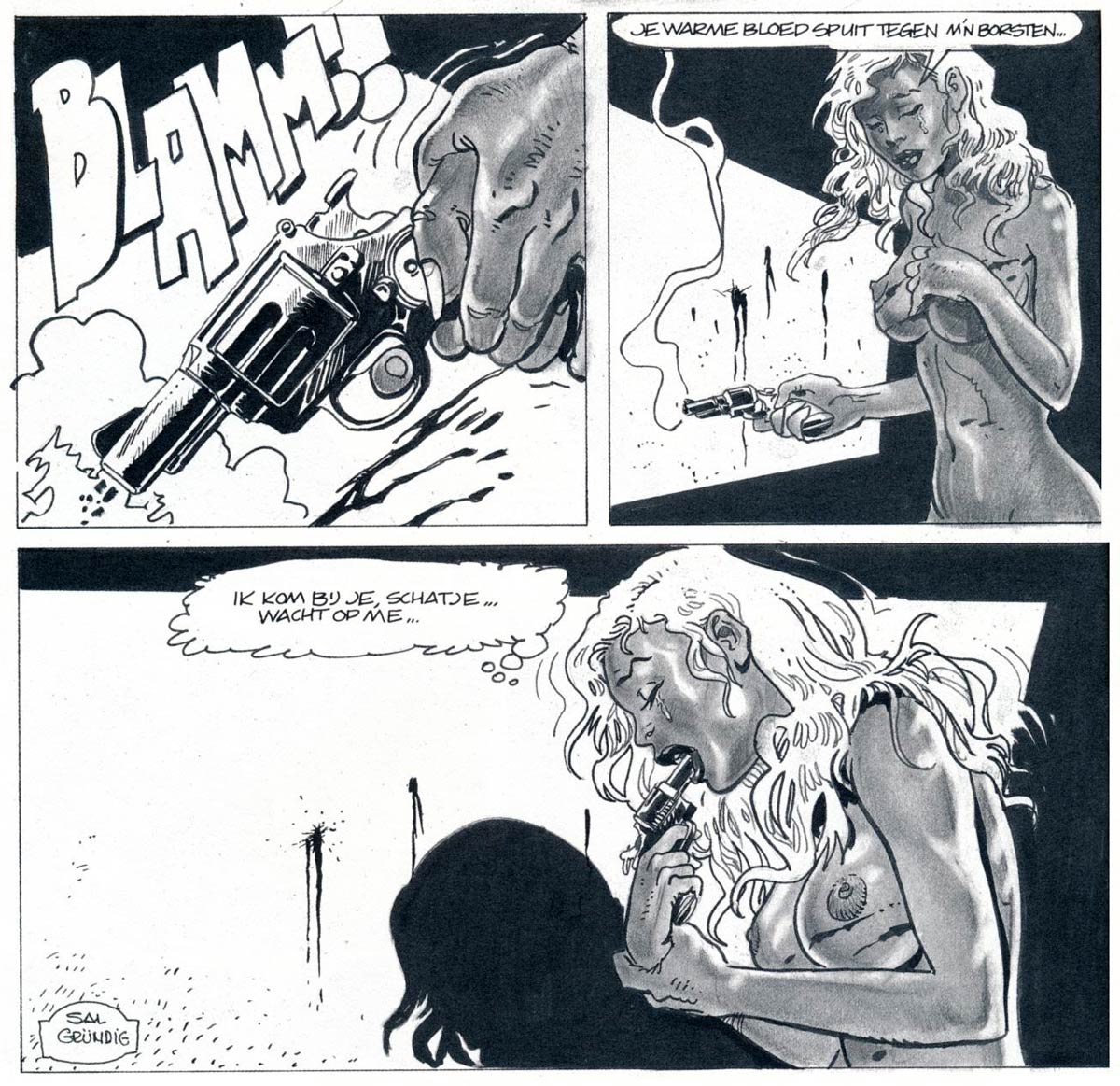His pornographic comics as Salomon Gründig have been published throughout Europe. Among his work in this genre are 'The Black Czarina', two stories of 'Malena', and three volumes of 'A Ruined Relationship'. Since 2014, Pedrazzini is the artist of 'Mild & Fromm', a comic series published in the Swedish Fantomen comic book.