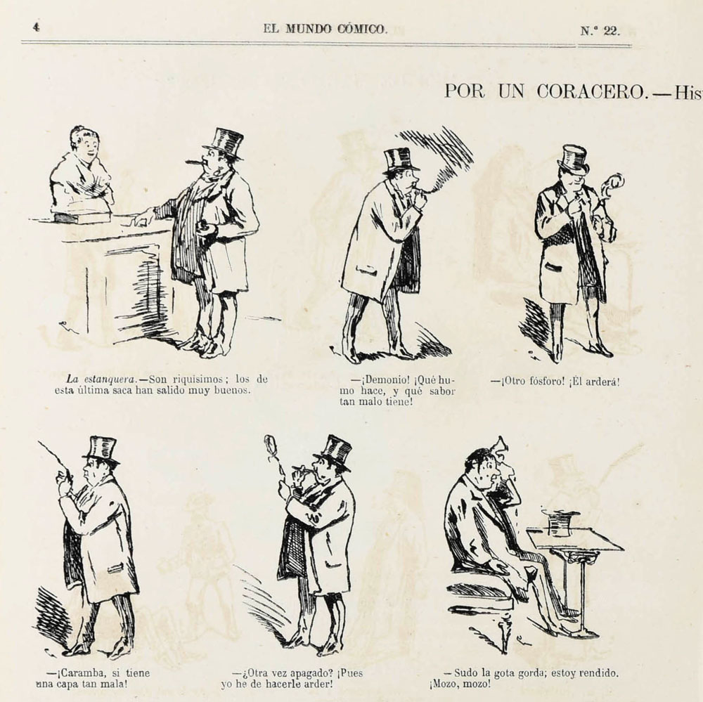 Consisting of eight pages, El Mundo Cómico offered a satirical look at Spanish customs and politics. It was also notable as the first known Spanish magazine to feature picture stories, which can be interpreted as the country's first comic stories. These were often series of images placed in pairs or in groups of three or four, so that they could be interpreted as primitive comics. Others were actual sequential narratives. On 26 January 1873, the picture story 'Una Pasión Desconocida' ("An Unfortunate Passion"), written by Ximenez Crox and illustrated by Pellicer, appeared on pages 6 and 7 of issue #13. In issue #22 (30 March 1873), Pellicer created a center-spread picture story under the title 'Por Un Coracero - Historia Triste Contada por Pellicer' ("By a Cuirassier - Sad Story Told by Pellicer"). In issue #24, another Pellicer comic appeared, 'Escenas Matritenses' ("Madrid Scenes"). Another comic pioneer that drew a picture story for El Mundo Cómico was Francisco Cubas.