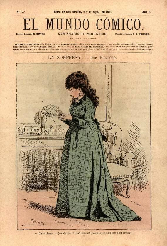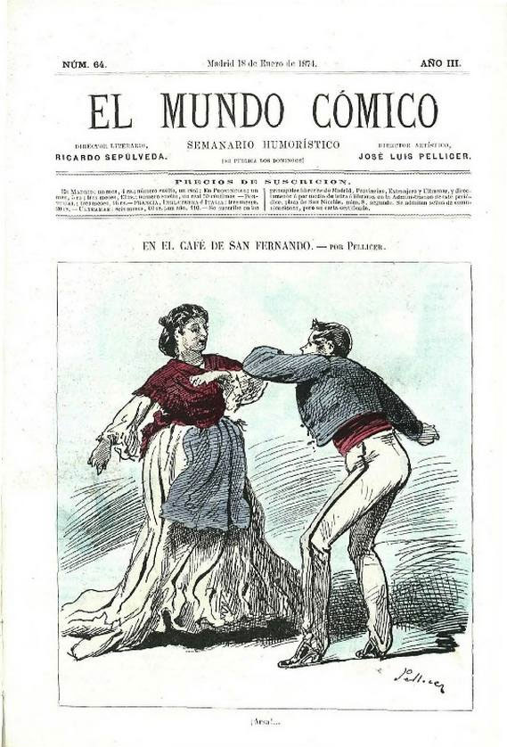 In November 1872, José Luis Pellicer was co-founder and art director of the satirical weekly El Mundo Cómico, published for four years in Madrid. Its chief editors were M. Matoses and Miguel Ramos Carrión, while Pellicer shared art direction duties with Félix Jaime y Mainar. The magazine's run fell within Spain's "Democratic Sexennium" (1868-1874), a time when freedom of the press permitted this type of publication. Still, the title frequently switched from printers during its four-year run.