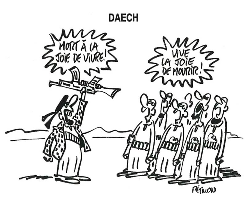 Cartoon from Le Canard Enchaîné (18 November 2015). Translation: "Death to the joy of living!" - "Long live the joy of dying!".