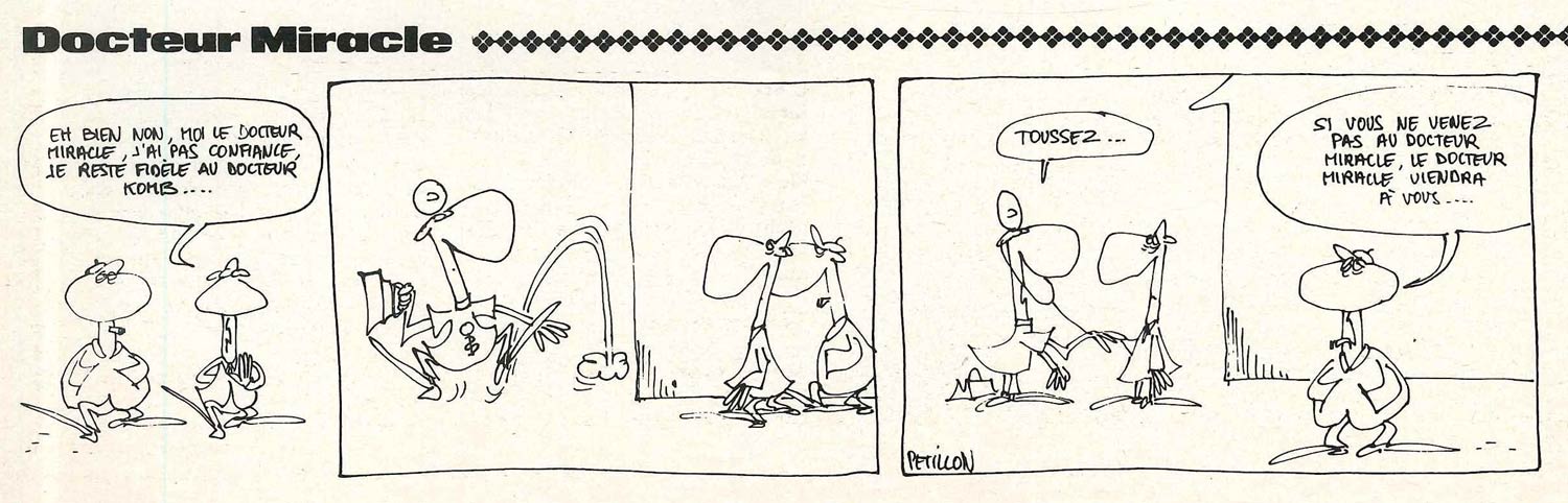 'Docteur Miracle', from Pilote #744 (7 February 1974). Translation: "Ah, well, no, me [go to] Dr. Miracle, I lack the confidence. I stay loyal to Dr. Komb..." - "Cough..." - "If you don't come to Dr. Miracle, Dr. Miracle comes to you...".
