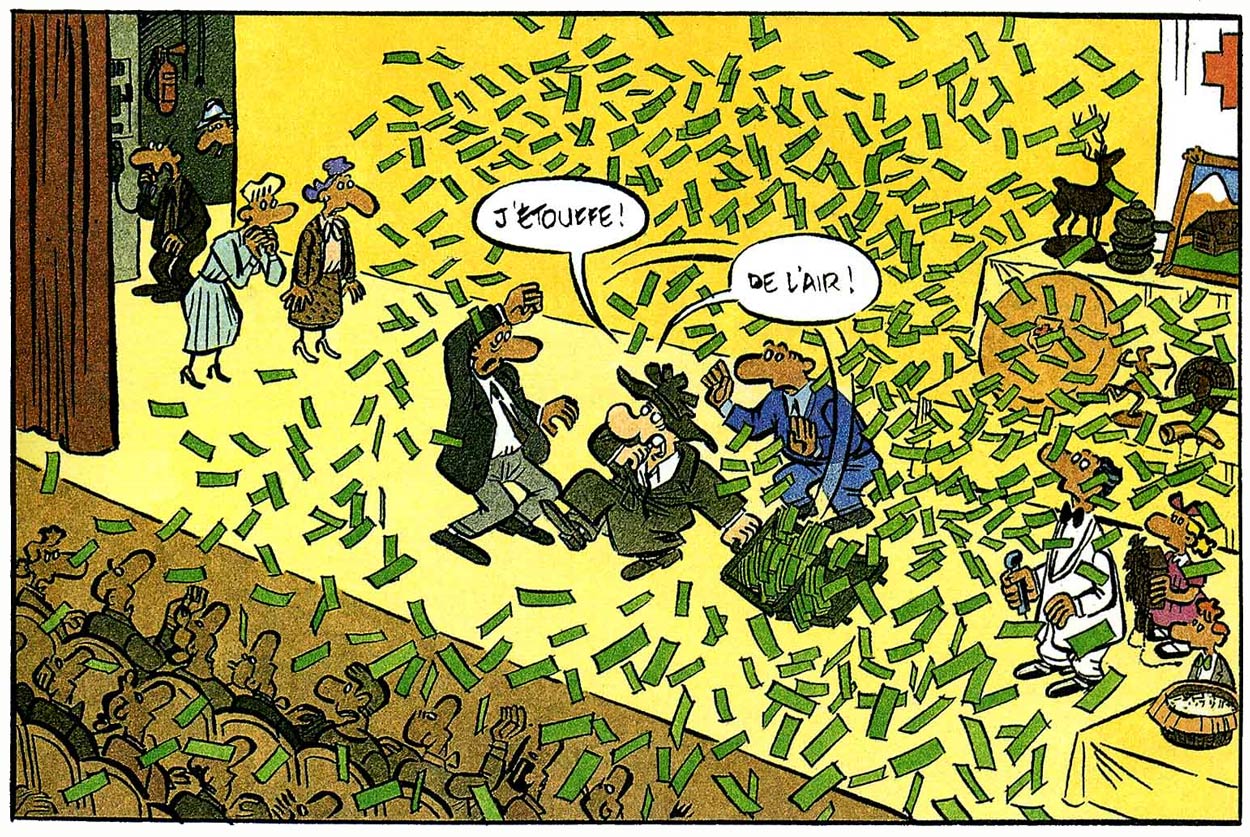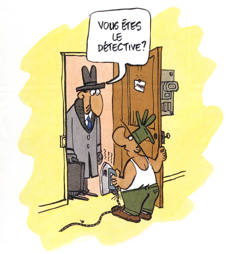 In issue #742 (24 January 1974) of Pilote, Pétillon introduced his signature series 'Jack Palmer'. Jack Palmer, also referred to as simply Palmer, is a tiny private investigator, dressed in an oversized trenchcoat and hat, and armed with merely a plastic bag of budget textile company Tati. Whereas most detectives actually solve mysteries, Palmer only seems to complicate his own investigations before finally bringing them to a good end. Pétillon constructed an absurd parody of the detective genre, popularized in the 1970s by various TV detectives, such as Columbo, played by Peter Falk. Largely inspired by the humor of Mad Magazine and the Marx Brothers, the cartoonist offered satirical commentary on politics, the media, the mob and jet set life, while also mocking his protagonist's fictional colleagues Sherlock Holmes and Arsène Lupin.