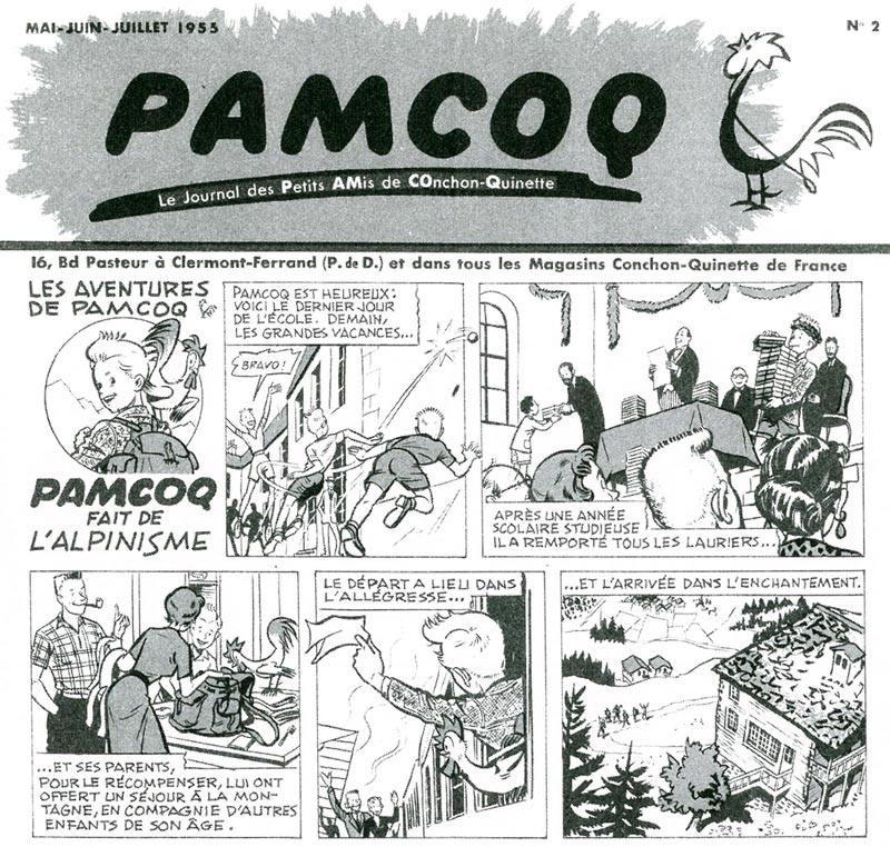 Between 1955 and 1957, Pétillot was involved with Pamcoq, an obscure advertising magazine of a clothing brand (Conchon-Quinette) of Clermont-Ferrand (Puy de Dôme - France). For issues #2 till 10, Pétillot illustrated 'Les Aventures de Pamcoq'. Later installments were drawn by Jean-René Le Moing.