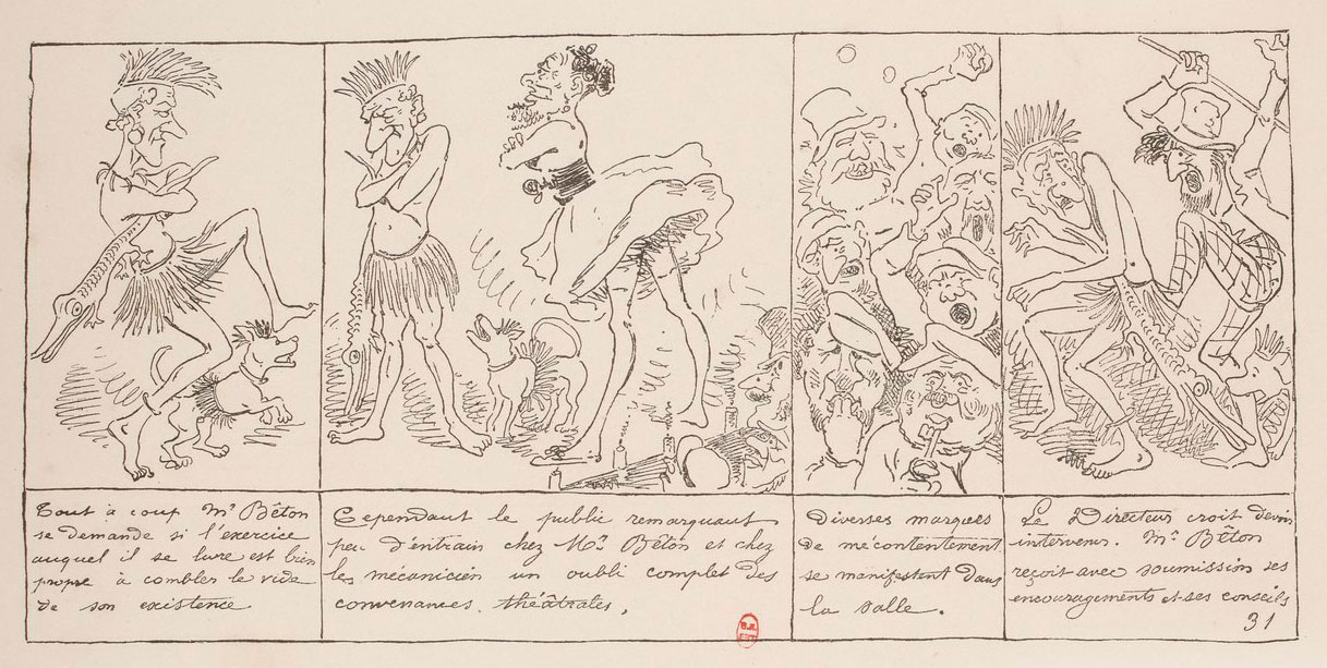 In 1867, Petit joined the magazines Le Hanneton and Le Bouffon. A year later, his drawings could be seen in L'Eclipse. During this period, he created the humorous comic strip 'Les Mésaventures de M. Bêton' (1867-1868), which follows a rather awkward slapstick narrative. Mr. Bêton hails from Valognes and travels to Paris with his dog and a stuffed crocodile that belonged to his father. During a bumpy train ride, he grows fond of a chubby woman. Unfortunately, the train has an accident and the machinist is thrown outside, losing all his clothes in the process. The police instantly arrest him for public indecency. Bêton and his female companion survive the accident and go to a local village festivity, where they dance until a policeman breaks up their fun. When they walk past the prison, they help the machinist escape, but the man instantly steals the women's dress to wear it himself. The trio is then hired by traveling acrobats to perform as a freak show act. The machinist plays a bearded lady, while Bêton and his female friend dress up as dancing African tribespeople.This part of the story openly portrays transvestism and a bare-breasted woman in a grass skirt.