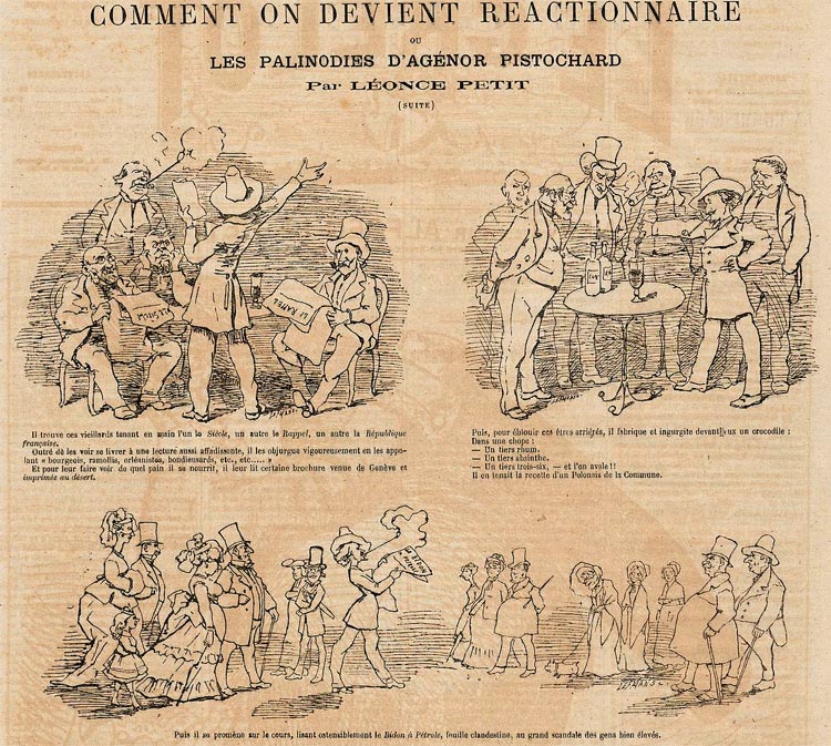 In 1873, Petit published work in the satirical magazine Le Grelot. Between 12 October and 9 November 1873, he contributed the text comic serial, 'Comment on devient réactionnaire, où les palinodies d'Agénor Pistochard' ("How one becomes reactionary, or the palinodes of Agénor Pistochard"), which was serialized in issues #131 through #135. The satirical story follows a student, Agénor Pistochard, who has strong political opinions, though more out of pose than any real conviction. When he learns that he inherited a fortune, he turns from a reactionary wanting to abolish the system into a snobby upper class conservative. From 1874 on, Petit's drawings were present in La Fronde as well. Between 1882 and 1884, he decorated the pages of L'Almanach du Père Gérard, Le Petit Journal pour Rire, Le Monde Illustré and the children's magazine Saint-Nicholas.