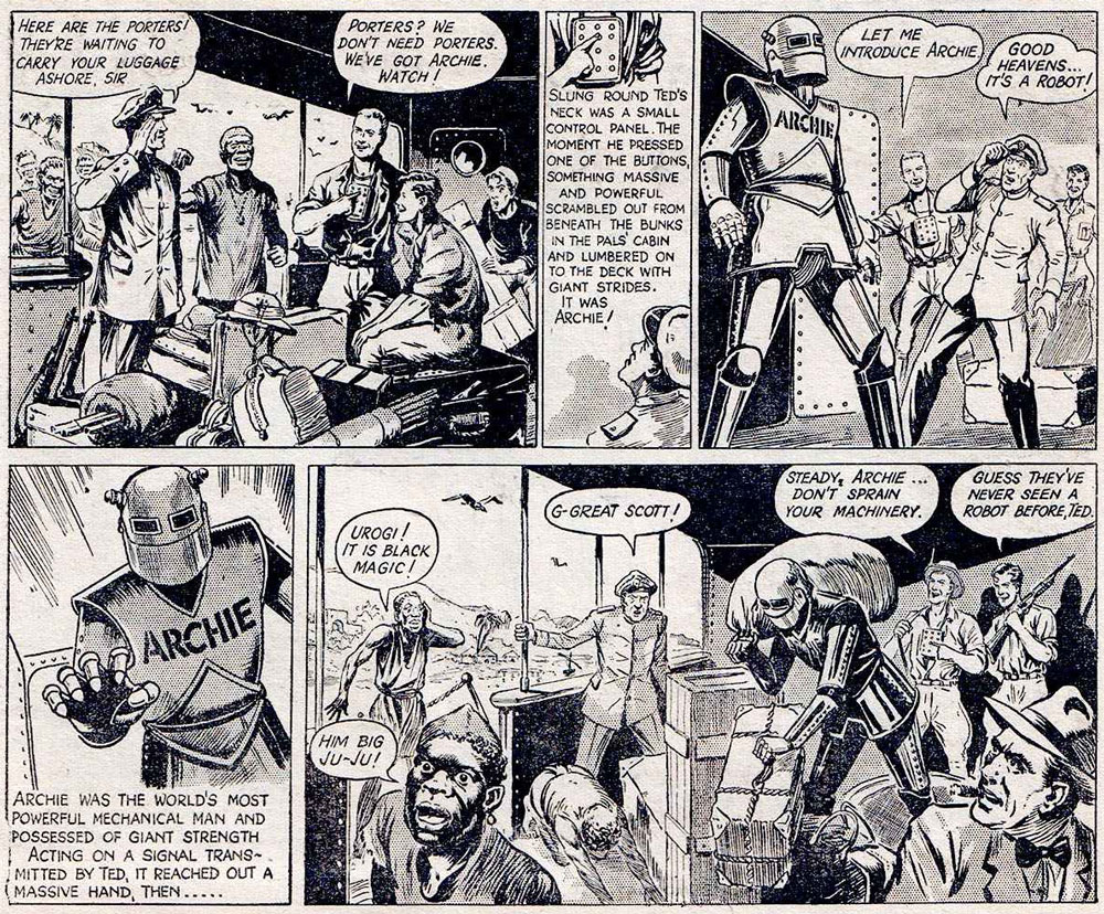 The "birth" of Robot Archie in 'The Jungle Robot' (Lion #1, 23 February 1952).