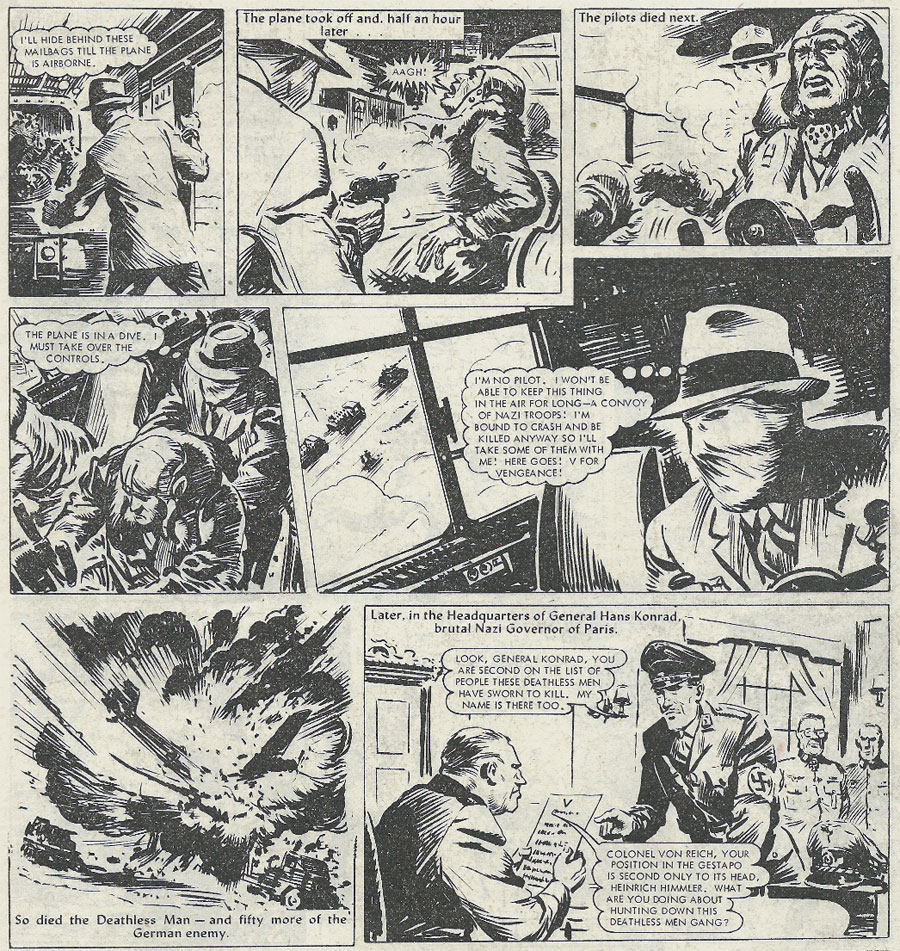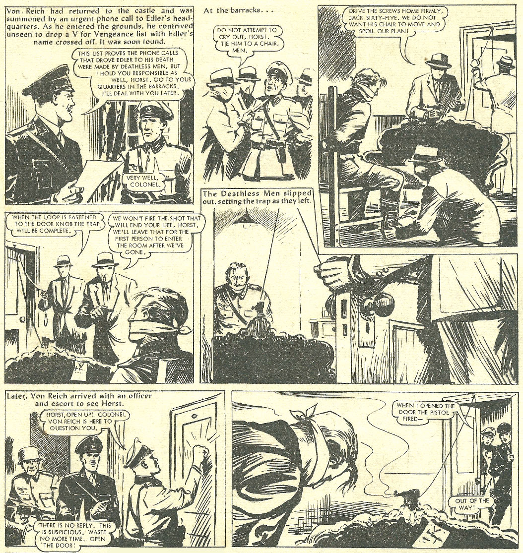 A long-running serial drawn by Alan Philpott was 'The Deathless Man' (1965-1980), about a faceless resistance group within Nazi Germany. The concept originated from the wartime serial 'V for Vengeance' that ran in 1942 issues of Wizard magazine. In 1965, it was adapted by Alan Philpott into a new picture story serial for DC Thomson's The Hornet, where it ran until 1975. Between 1976 and 1980, 'The Deathless Men' was continued in The Hotspur. The group was a grey-clad, grey-masked secret army of escaped prisoners from Nazi concentration camps. Each member was code-named Jack, followed by a number. Their leader Jack One was the secret identity of Colonel Von Reich, second-in-command of the Gestapo, but in reality the infiltrated British secret agent Aylmer Greyson. Later episodes are drawn by other artists.