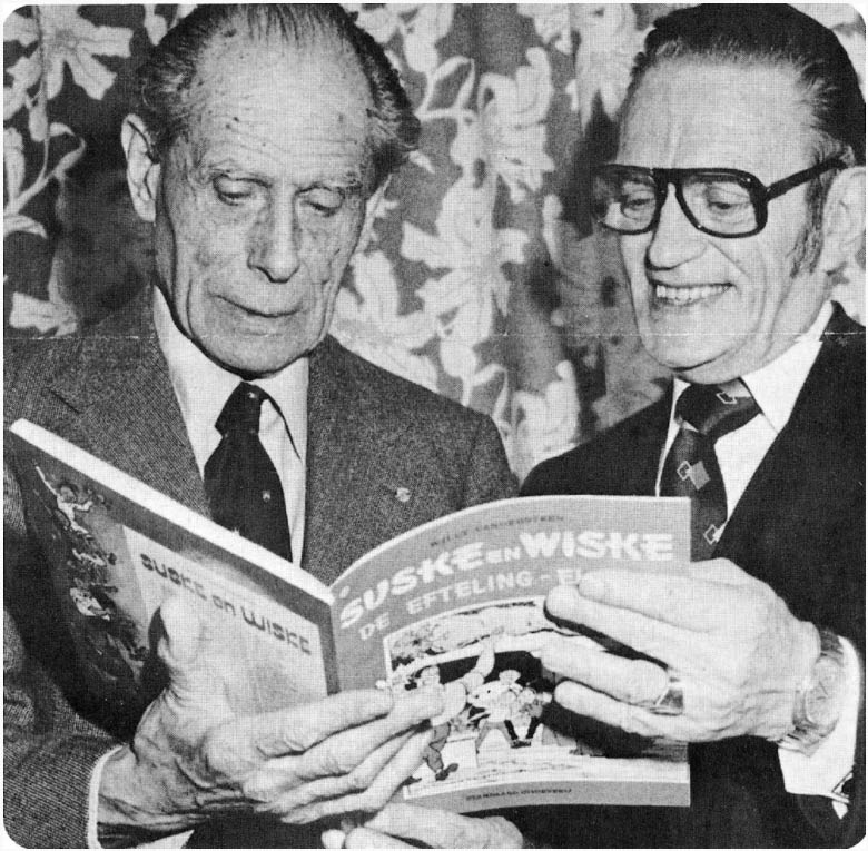 Anton Pieck with Willy Vandersteen, looking at the Suske & Wiske album 'De Efteling-Elfjes'.