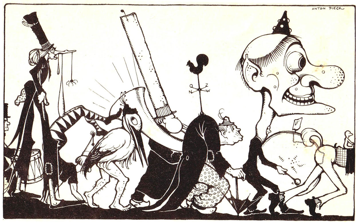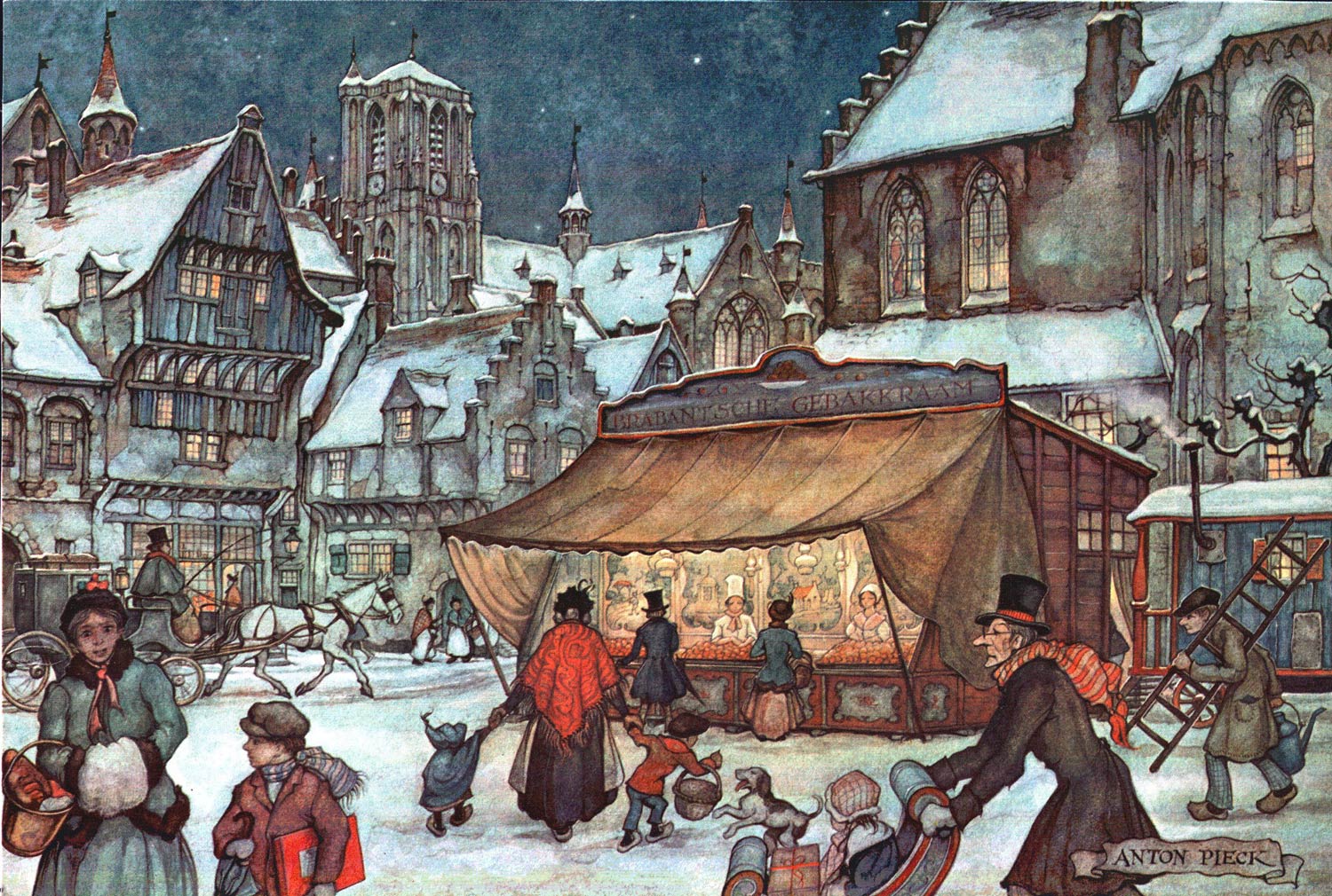 Anton Franciscus Pieck was born in 1895 in the harbor town of Den Helder in the province of North Holland. His father had a small position with the Royal Dutch Marine, and his mother was a housewife. The family was never well off, so young Anton and his twin brother Henri escaped the gloom of poverty by playing outside, reading and drawing. The brothers both studied at the Royal Academy of Fine Arts and the Bik & Vaandrager Drawing Institute in The Hague. Among Anton Pieck's graphic influences were the 19th/20th century city and landscape painters Herman Heuff, Henri Daalhoff, Theo Goedvriend, Adrianus Mioléé, Cornelis Springer, George Hendrik Breitner, Carl Spitzweg, Charles Rochussen, Walter Vaes, Henri De Braeckeleer, W.O.J. Nieuwenkamp and Carl Larsson, as well as the classical painters Pieter Bruegel the Elder, Albrecht Dürer, Rembrandt van Rijn, Johannes Vermeer and Frans Hals and the international graphic artists Hokusai, Gustave Doré, George Cruikshank, Arthur Rackham, Edmond Dulac and Hablot Knight Browne.