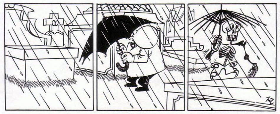 Pil's most famous comic strip is 'Meneerke Peeters', which ran in De Standaard from 7 January 1957 until his retirement on 1 October 1983. The main character is a little mustached man with a colossal nose - even bigger than his head - and with one of most common family names in Flanders. However, Pil based his character on an archaic Flemish expression, "meneerke Peeters" ("little mister Peeters"), used to address people one couldn't take too seriously. 'Meneerke Peeters' was a pantomime comic strip, usually counting about three or four panels. Over a period of 26 years, Pil drew 7,008 gags. Given their lack of dialogue, they could have been easily seen in publications abroad. However, 'Meneerke Peeters' only ran in the French-language Belgian newspaper La Dernière Heure. In 1972, Heideland-Orbis brough out one compilation book: 'Meneerke Peeters. Stop-comics van Pil'. Decades later, a new compilation book was released by the Mercatorstripbeurs: 'Non-Sense Story' (2005).