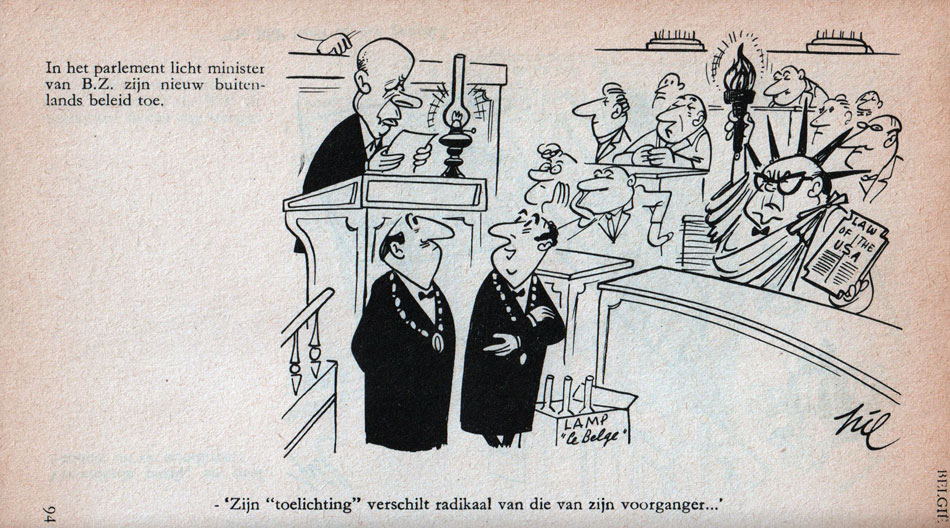 From: 'De Pilgrimstocht der Mensheid', containing cartoons published in De Standaard between 1962 and 1967. The cartoon depicts Belgian Minister of Foreign Affairs Paul-Henri Spaak, dressed up as the Statue of Liberty. The caption reads: "His "clarification" is radically different from his predecessor."