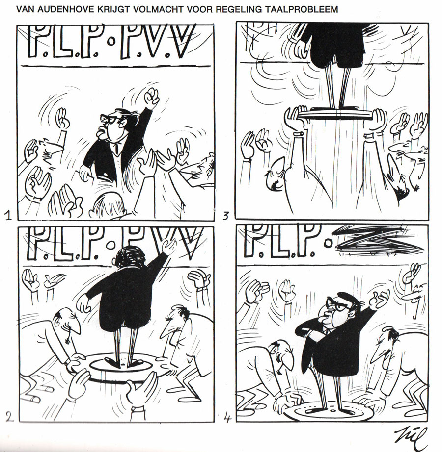 From: 'Pilkuren' (1969), a collection of Pil cartoons about the Flemish-Walloon language struggles. The man in the black suit is Omer Vanaudenhove, who was leader of the Belgian Liberal Party PVV-PLP at the time. In the cartoon he "solves" the bi-lingual differences in his party by simply crossing out the Flemish division of the party (PLP) and striking a Napoleon pose afterwards.