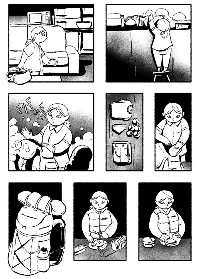 Bianca Pinheiro has an eclectic drawing and narrative style, demonstrated by the variety of themes in her graphic novels. While the previously mentioned 'Bear' and the two 'Mônica' books aimed at younger readers, she also self-published graphic novels for a more mature audience. Her first effort was the crowdfunded 'Dora' (2014), a horror story about a girl accused of 15 murders. It was reprinted in 2016 by Editora Mino. With writer Grégorio Bert, she envisioned a woman's journey of self-discovery in the book 'Meu Pai É Um Homem da Montanha' ("My Father is a Mountain Man", 2015). 'Alho-Poró' (2017) on the other hand was about a group of friends looking for leeks ("alho-poró" in Portuguese) to make a quiche. Behind this seemingly light-footed facade, Pinheiro created a complex and tragic story, which subtly tackled the concepts of femininity, violence and friendship. A Spanish edition was published under the title 'Quiche De Puerro'.
