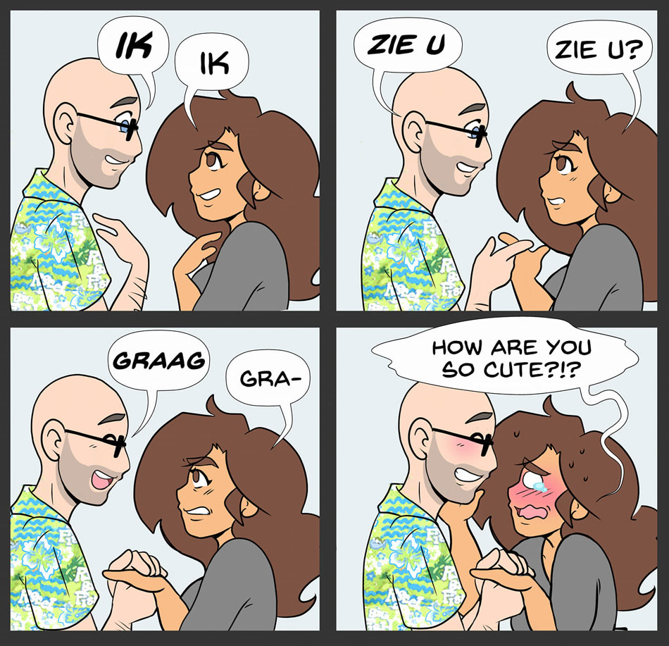 Apart from their trans-Atlantic romance and cross-cultural observations, 'Waffley Wedded' also reports how Pinnola tries to integrate in Belgian society. She obtained legal residency, a work permit and a passport, but finds out that getting a marriage certificate is more difficult, given that she needs a German birth record. She also follows a Belgian integration and Dutch-language course. To practice her new native tongue, she watches the Dutch dub of the Disney animated TV series 'Darkwing Duck'. In one episode of her strip, she feels embarrassed when her partner lets her order something in Dutch. Sometimes she feels despair over bureaucratic complications or her struggle to master Dutch. But her partner always manages to comfort her.