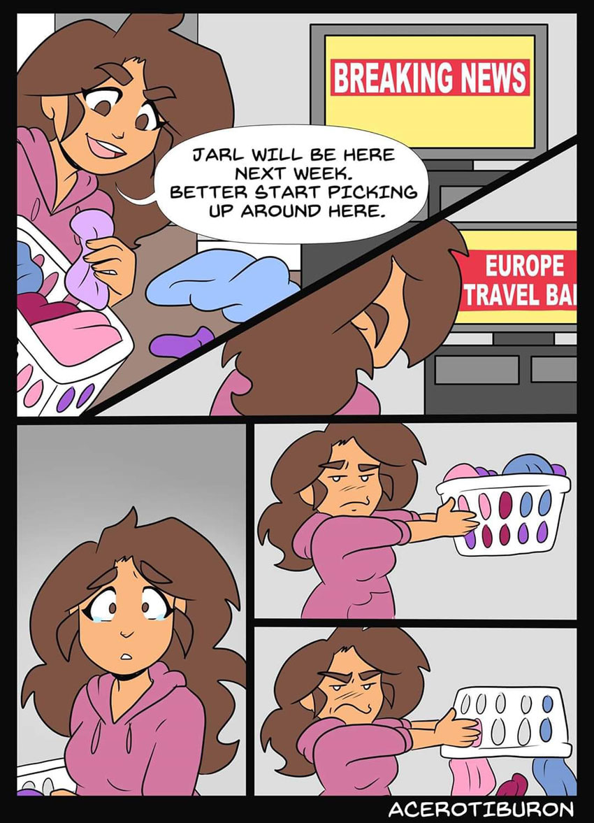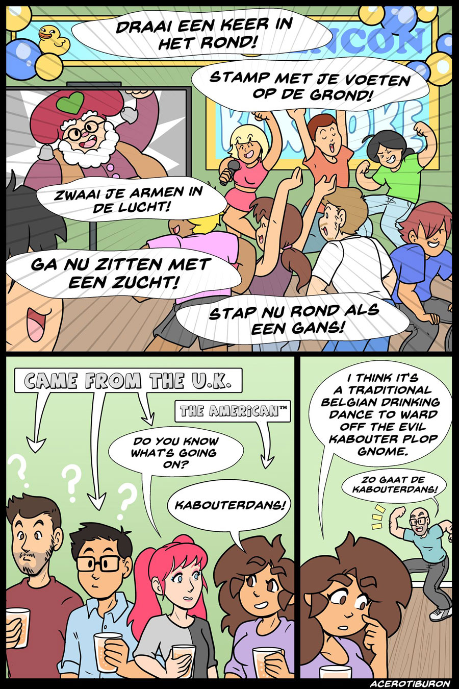 Antonia Pinnola, who uses the pseudonym Acerotiburon, is a German-born, U.S. webcomic artist who moved to Belgium in 2021. She is most notable for her retroactively titled series 'Waffley Wedded' (2019- ), about her relationship with her Flemish partner. The episodes revolve around their happiness as a couple, but also her impressions of Belgium from a foreigner's perspective. Pinnola also makes more fantasy-based comics, like a sword & sorcery series starring herself and friends as gnomes and elves, as well as a funny animal gag comic starring her cat Soup as a store employee. All her webcomics are drawn in a manga-flavored style.