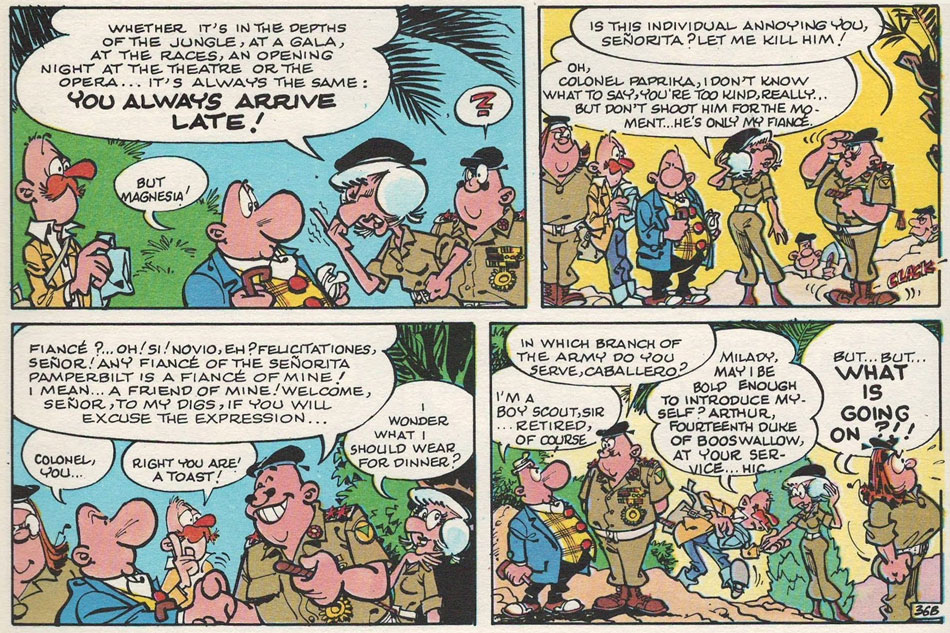 During the 1980s, Robert Pire rejoined Greg, assisting again on his signature comic 'Achille Talon'. One of his projects was helping Greg with getting his comic published on the American market. He redrew most of the 1977 album 'Achille Talon et le Trésor de Virgule' for its 1981 American release by Dargaud: 'Walter Melon - Magnesia's Treasure'. This has remained the only translated episode. Greg and Pire also worked on a newspaper gag strip version of 'Achille Talon', which didn't go into international circulation, but was printed in the French TV magazine Télé Star (1980-1981).