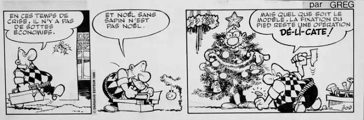 'Achille Talon' strip for Télé Star. Translation: "In these crisis times, there aren't economic fools. And Christmas without a pine tree isn't Christmas. But whatever is the model, pinning down the foot remains a DELICATE undertaking!"