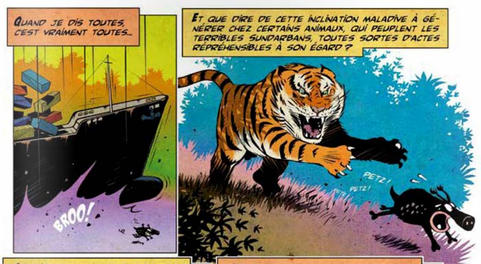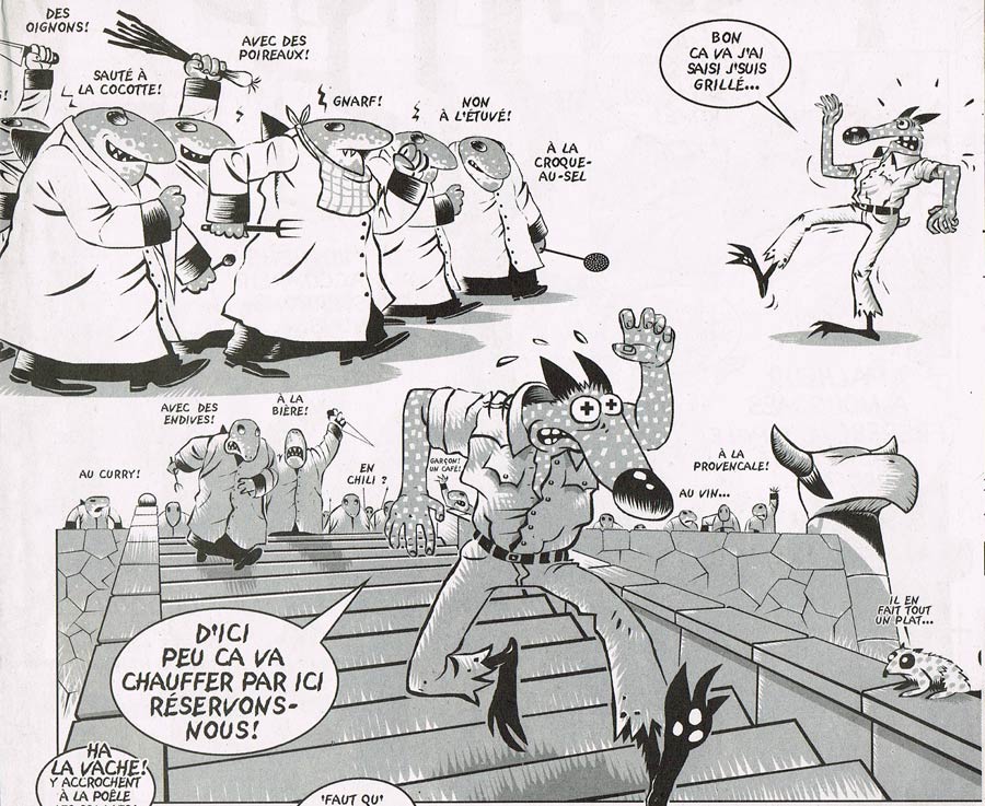 Pixel Vengeur is the author of 'Black & Mortamère' (Le Cycliste, 2005-2010), a series which parodies a wide variety of comic authors and genres, from E.P. Jacobs, Franquin and Philippe Geluck to the superheroes of Marvel Comics. He has participated in a tribute to Gilbert Shelton's 'Fabulous Furry Freak Brothers' (Les Requins Marteaux, 2004) and is responsible, with Fabcaro, for a series of new comics starring Gotlib's dog 'Gai-Luron' (Audie, 2016). Pixel Vengeur has worked with Monsieur Le Chien on the absurd humor comic album 'Les caniveaux de la gloire' in Audie's Fluide Glacial Trafik label. His art has also appeared in several installments of Vide Cocagne's 'Alimentation Générale' anthology series. This Nantes-based label also published Pixel Vengeur's book 'Le Petit Livre Noir en Couleur de Dominique' in 2014.