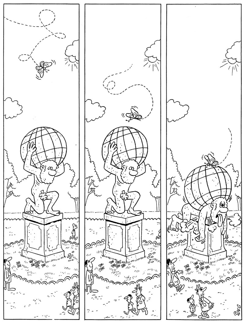 Born in 1935 in the Antwerp district Borgerhout, Edouardus "Eddy" Ploegaerts studied at the Sint-Lukas School of Arts in Brussels. In 1959, he participated in the annual cartooning competition "Salon van de Vlaamse Humor" (Salon of Flemish Comedy) in Antwerp, marking his debut as a cartoonist. He also took part in the 1961 and 1963 editions, and won the Public Award during the 1965 Cartoonale in Heist. Among his inspirations were the pantomime movie humorists Jacques Tati and Charlie Chaplin and comics like Guy Bara's 'Max l'Explorateur' and Morris' 'Lucky Luke', as well as animated cartoons and British humorists.