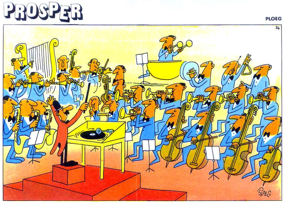 By 1974, most of Ploeg's other strips and cartoons in Tintin made place for his pantomime gag strip 'Prosper'. The character Prosper originated from the short serial 'Prosper Le Pirate', that Ploeg made in collaboration with scriptwriter Michel Greg for Tintin issues #49 of 1966 through #2 of 1967. Five years later, Ploeg picked up this character again and began using him in pantomime gag strips. Prosper is a bald-headed, big-nosed man with a Chaplin mustache and bowler hat. The first episode saw print in issue #12 of 1971 (1 August) and new gags appeared sporadically from then on. It wasn't until late 1973 until 'Prosper' enjoyed a steady, almost weekly publication, lasting up until 1978. Despite its longevity, Lombard never compiled the strips in book format. Only in 2006, a limited edition compilation of 'Prosper' cartoons was released on the occasion of that year's Mercator Comics Fair in Kruibeke, Belgium.