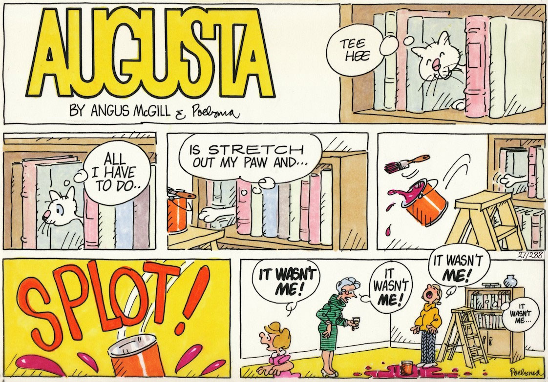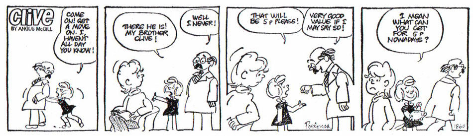 Running for over three decades, both 'Clive' and 'Augusta' became beloved appearances in the Evening Standard, as well as the Mail on Sunday's You magazine and other newspapers. During the 1970s and 1980s, the strip was also distributed in the USA by the Universal Press Syndicate. During the 1970s, several book collections with McGill and Poelsma's comic strip were released, among them 'Clive in Love' (W.H. Allen/Virgin Books, 1970) 'Clive and Augusta' (W.H. Allen/Virgin Books, 1971), 'Augusta the Great' (Barrie and Jenkins, 1977) and 'I, Augusta' (Barrie & Jenkins, 1978).