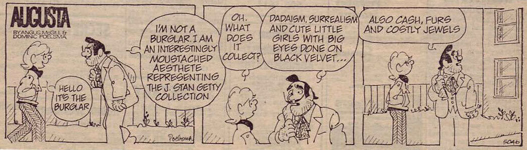 At the London Evening Standard, Poelsma teamed up with the columnist Angus McGill, who wrote about the eccentricities of life in the capital city. In 1968, their collaboration resulted in the comic strip 'Clive' (1968-1999), about a rather clueless teenage boy who tries, but fails, to keep up with the trendsetters around him. The strip was filled with a colorful cast of characters, such as the burglar with his hopeless disguises and Clive's outrageous Grandma with her string of younger lovers and endless stories of her colorful past. One character that particularly stood out was Clive's belligerent younger sister, Augusta - so much in fact, that she eventually took center stage in the comic, which was renamed to 'Augusta' somewhere in the 1980s.