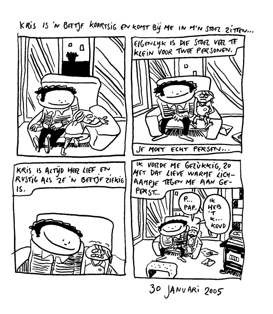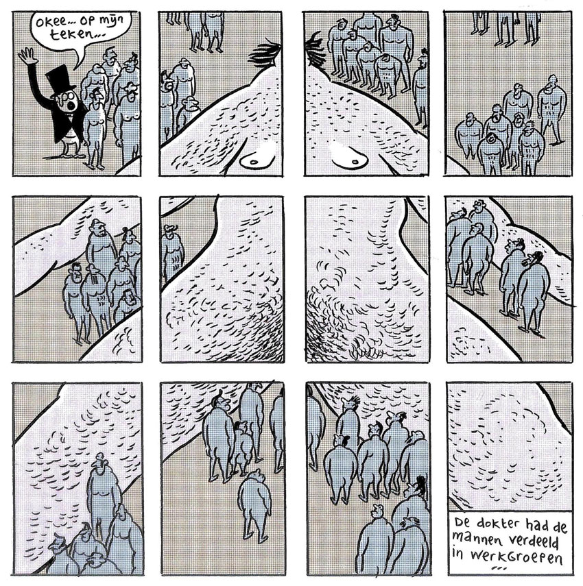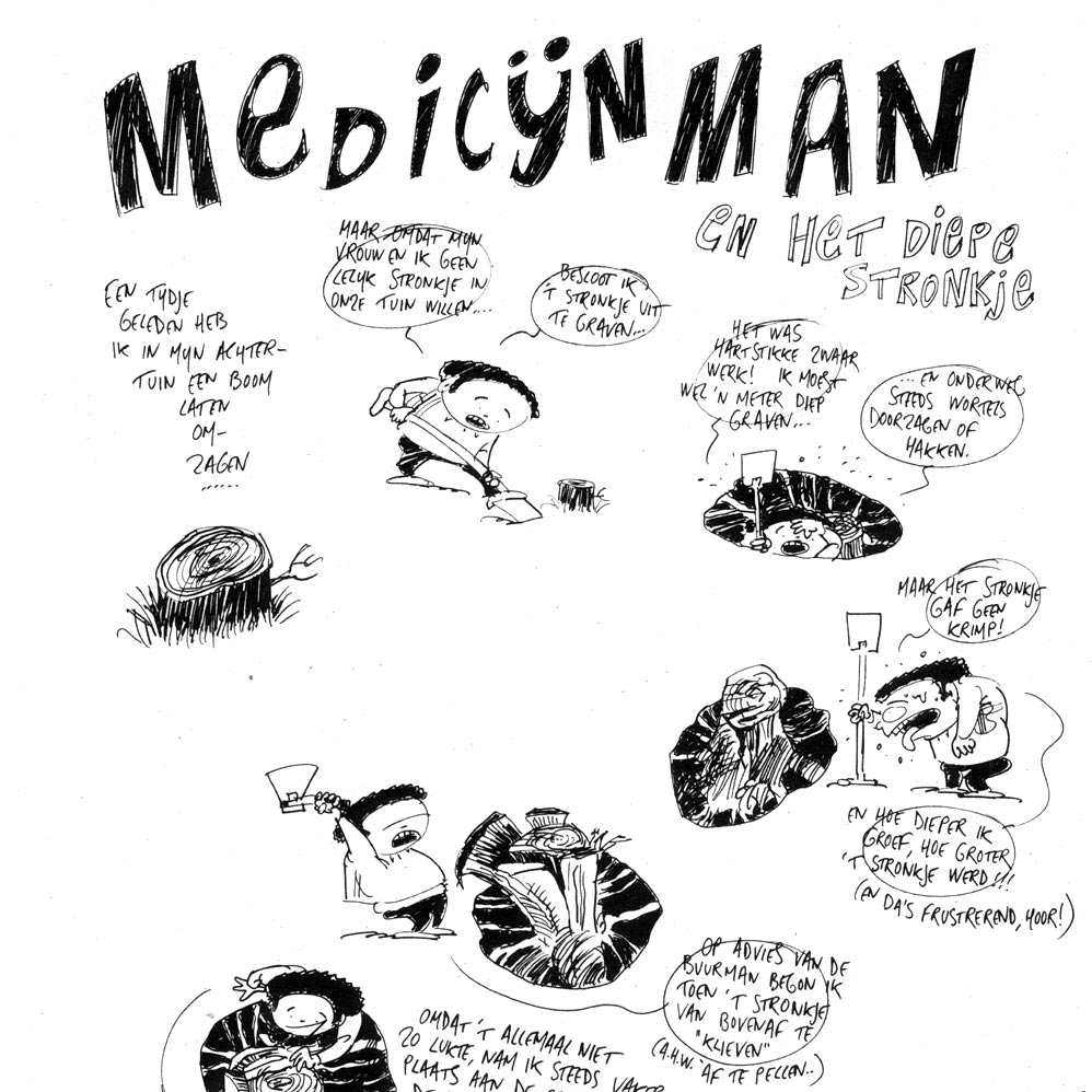 Under this title, Van de Pol quickly established his trademark focus on everyday trivialities and the absurdities of life. While the name "Medicijnman" hints at superhero bravado, the artist's portrayal of himself is far from that. Scenes from his dull day job are mixed with embarrassing moments, clumsy household behavior and descriptions of seemingly irrelevant events. All of these banalities are enhanced by the comic's scribbly drawing style and messy page layout. Even though Van de Pol is generally a shy man, he has made his comics with shameless candour and self-mockery, including private moments like going to the toilet and bedroom activity. In an interview with Peter van Brummelen for Het Parool (25 January 2025), Van de Pol remarked: "I try to use as little self-censorship as possible. If it's not honest, then it's nothing. But it's not that I have no shame at all, because I only show what I want to show."