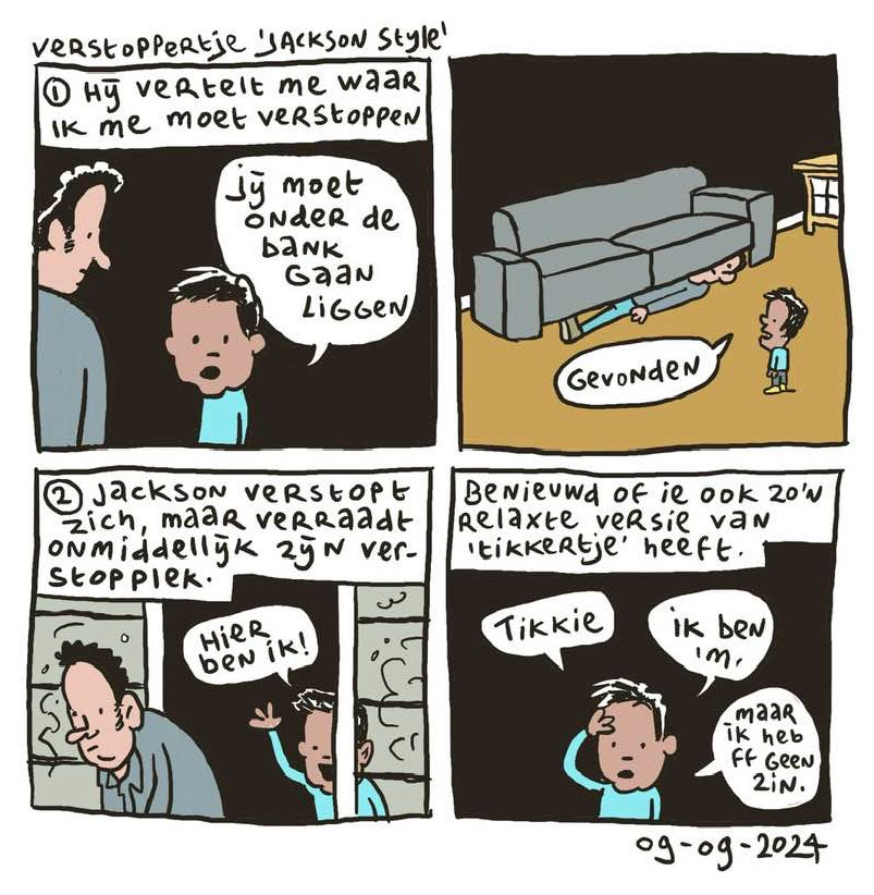 Diary strip by Michiel van de Pol of 9 September 2024 about playing hide-and-seek with his grandson Jackson.