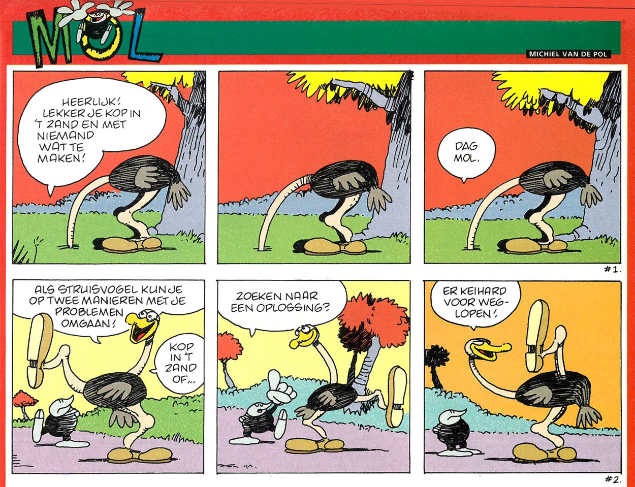 'Mol' (SjoSji #19, 1997-19). Translation: "Lovely! Head in sand and nobody to bother you. Hi mole." - "As an ostrich you can deal with your problems in two different ways! Head in sand or..." - "Looking for a solution?" - "Running from it as fast as possible!".